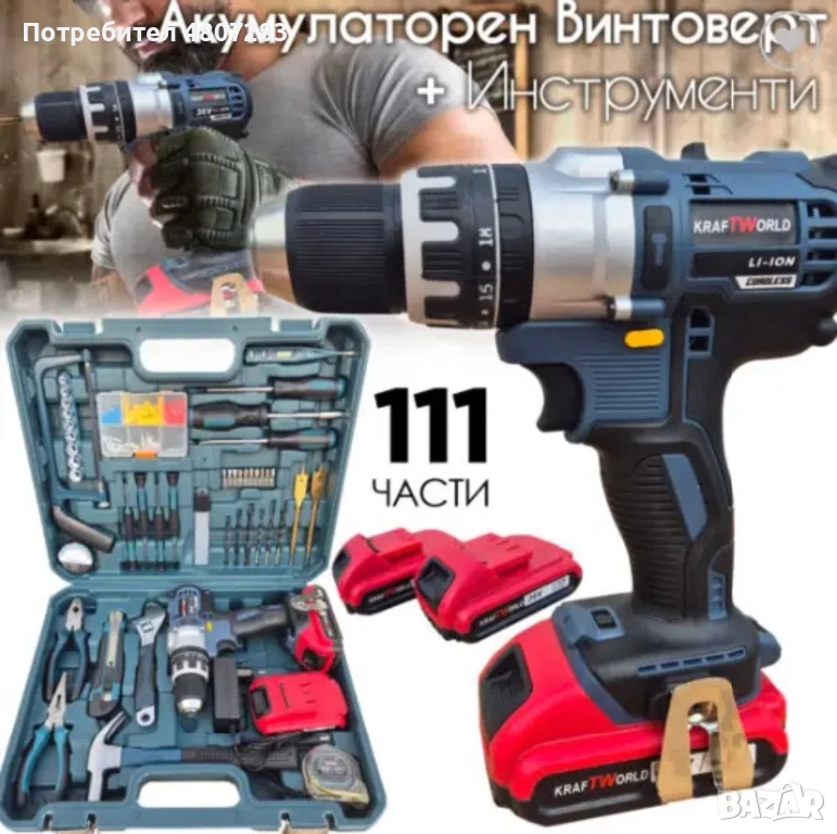 🔋 Акумулаторен Ударен Винтоверт 111 части – мощност, контрол и пълен комплект за всяка задача! 🛠️