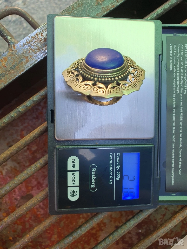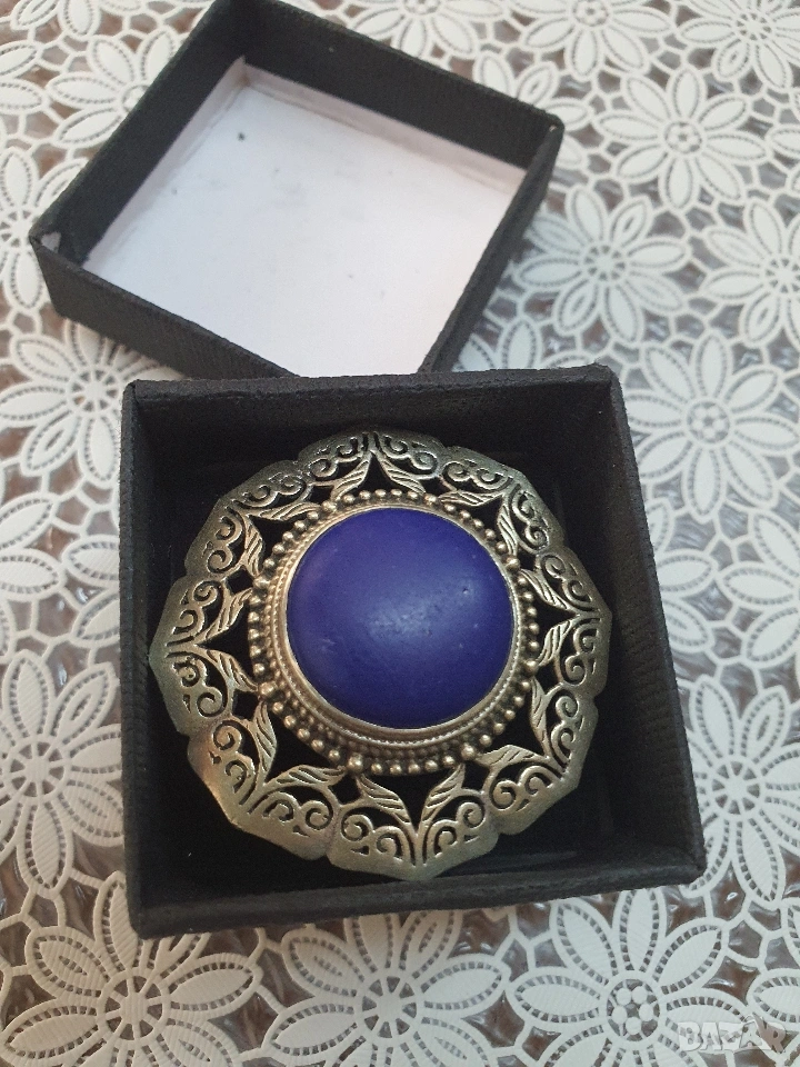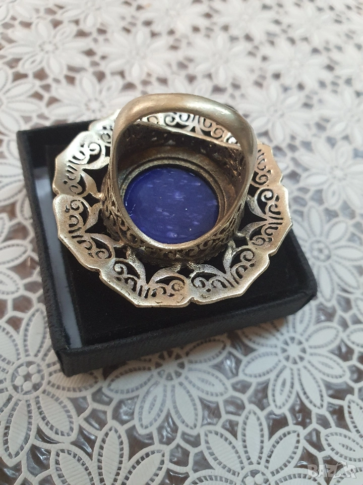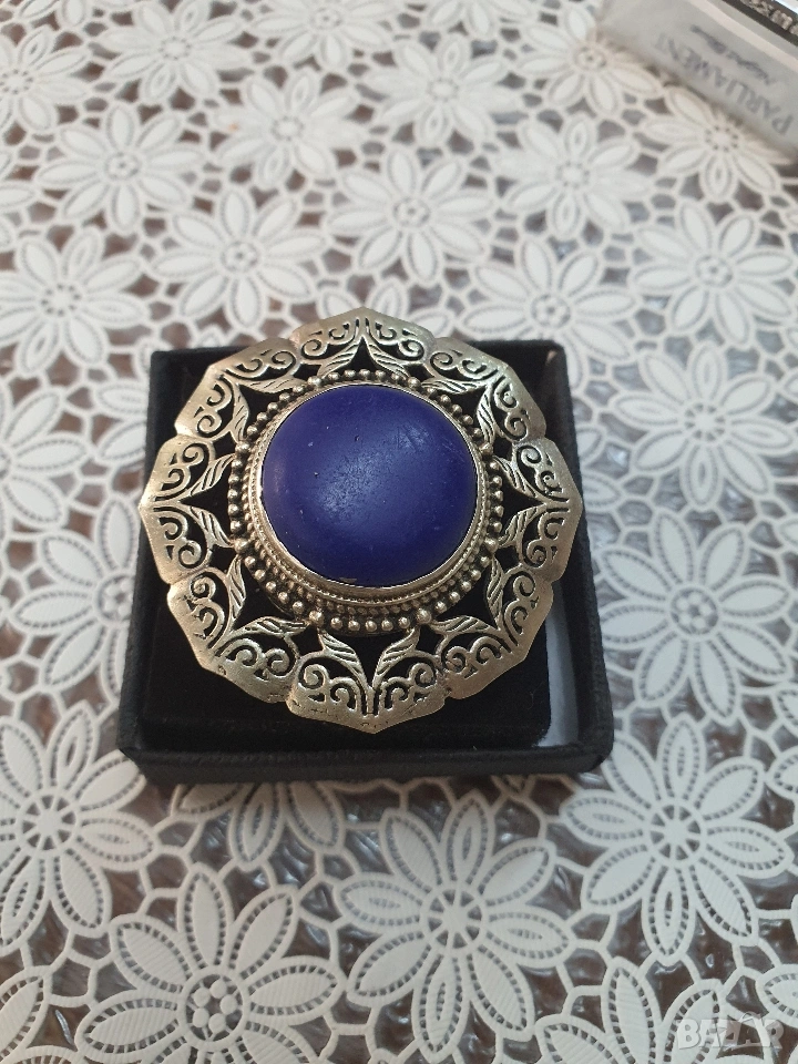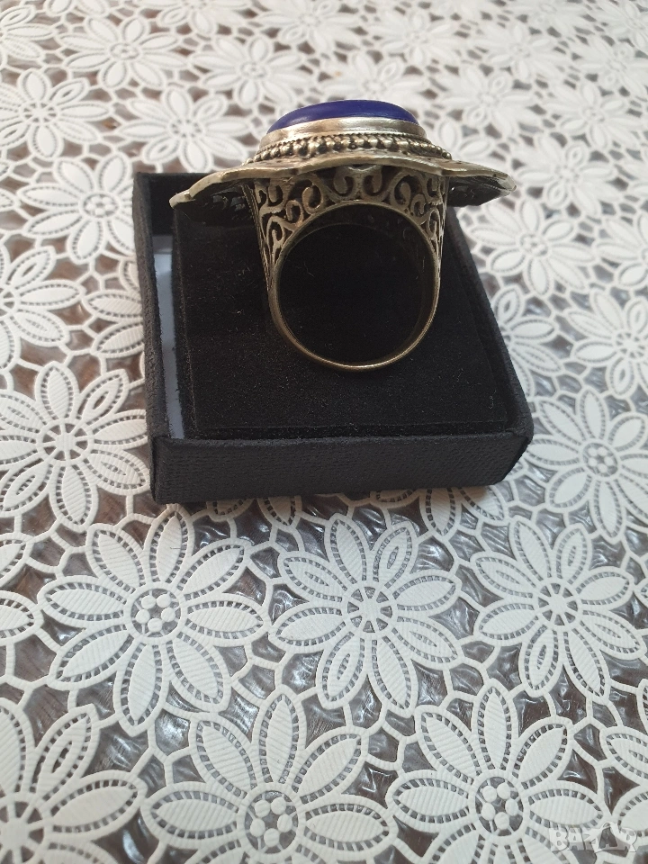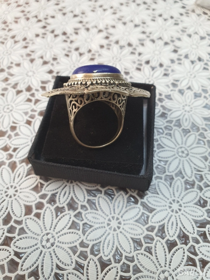 Диаметър-4,5 см.Това бижу изглежда е сребърен пръстен с лапис лазули (лазурит), характеризиращ се с наситено син цвят и богато орнаментиран обков. Подобни изделия често са ръчна изработка от сребро проба 925 и се отличават с детайлни мотиви около централния камък.