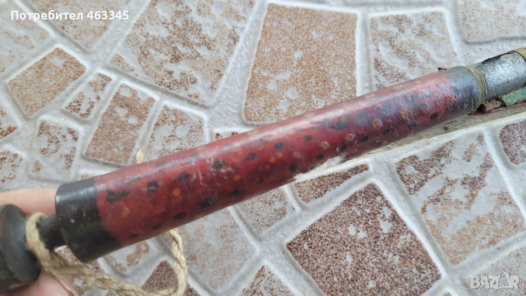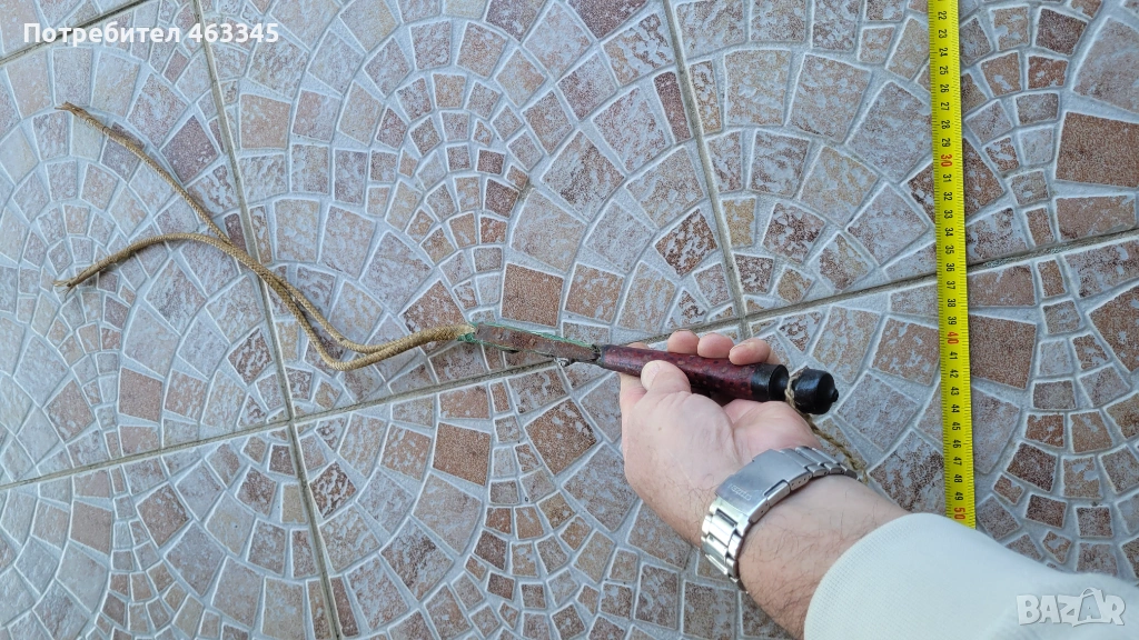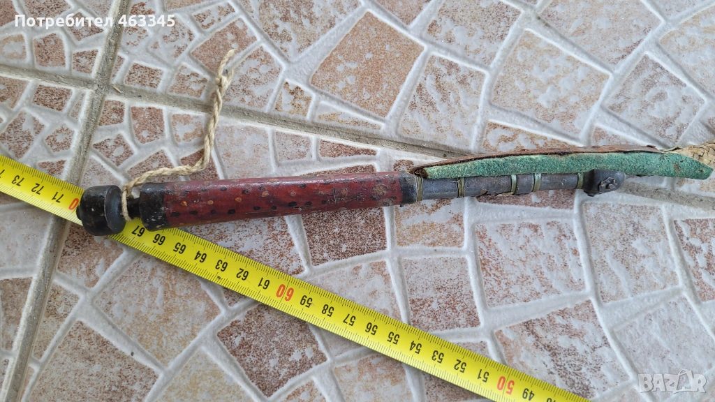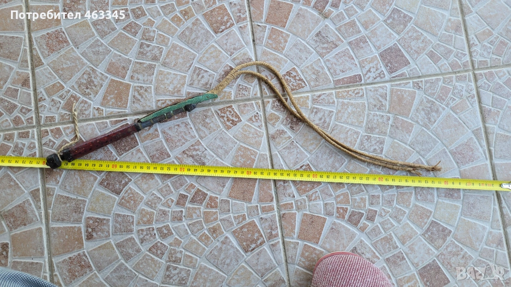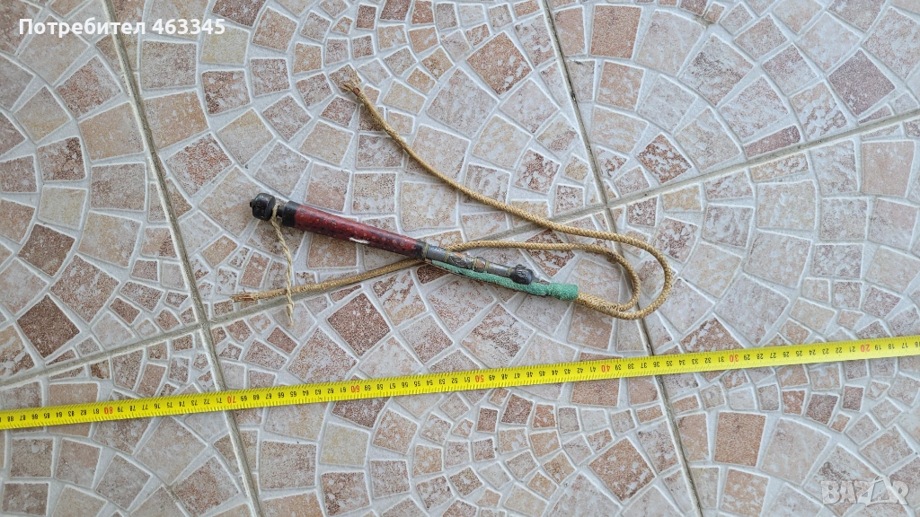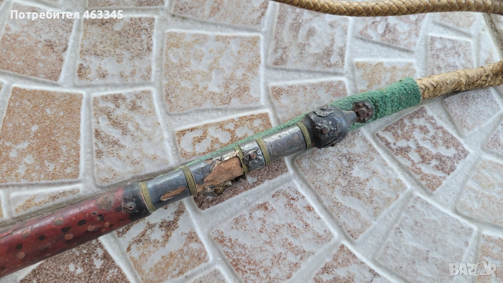 Арабски камилски камшик с две жила. Жилата са изработени от кожена сърцевина с наплетени кожени ивици отгоре. Много интересна плетка. Дръжката е от дърво с цветна украса, която е била свързана с жилата със сребърен орнамент, украсен с ниело. Орнаментът се е повредил и камшикът е бил ремонтиран навремето