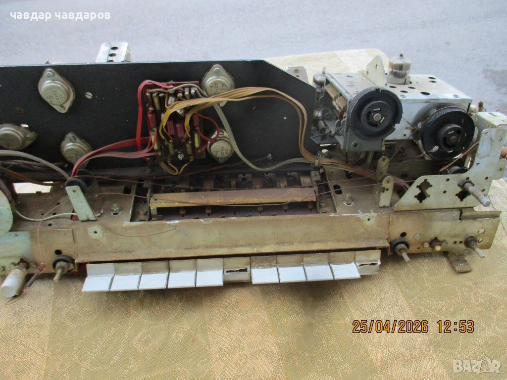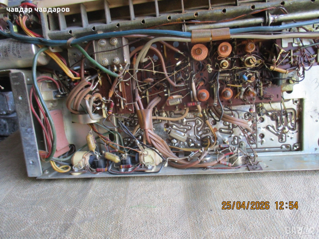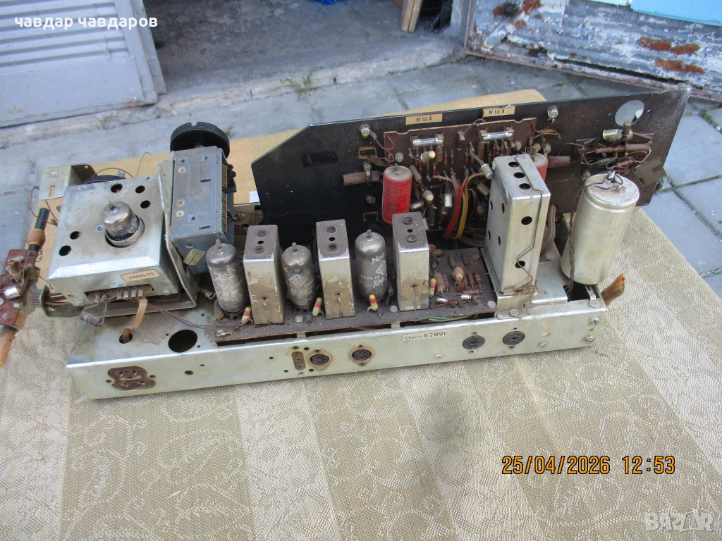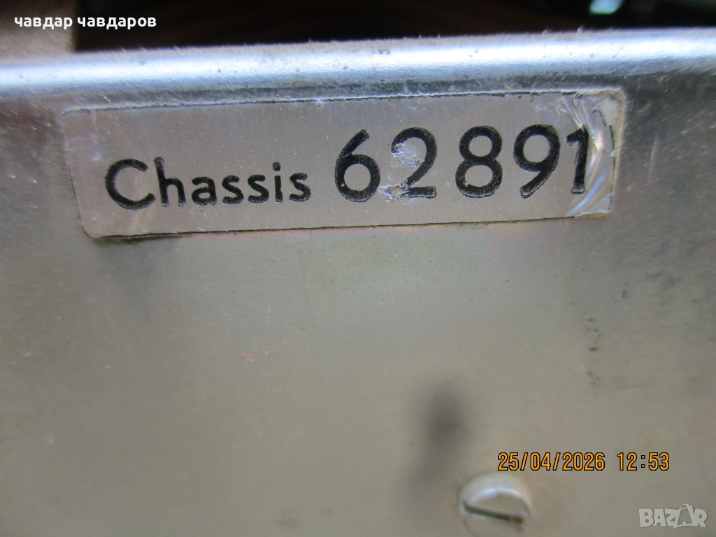 Шасито е интересно с това ,че е хибрид.Високо честотната част е лампова ,а ниско честотната е транзисторна.Германска изработка.Разбира се ,че е с липси :няма скално стъкло с надписани радиопредаватели,няма мрежов траф,но иначе по шасито не съм си позволявал да махам части.Интересно е като изпълнение и ще грабне душичката на всеки любител.Мисля че е Грундиг или Льове Опта.Бях му намерил схемата но мина много време и съм забравил.Ще потърся схемата ако настоявате.Сега трябва да освобождавам едно помещение и затова се разделям с него.