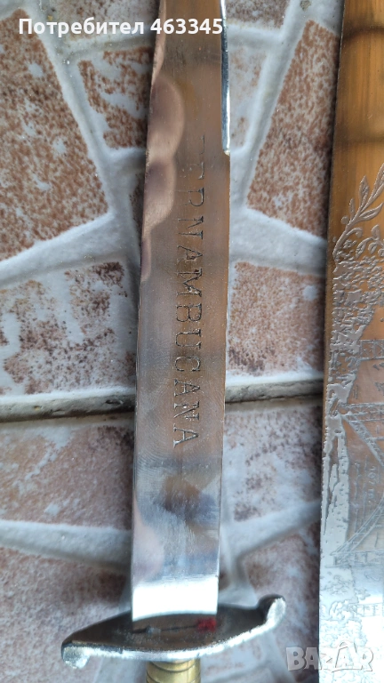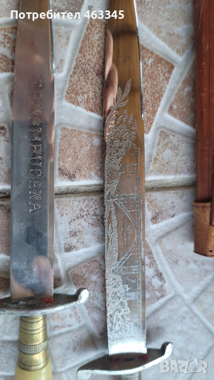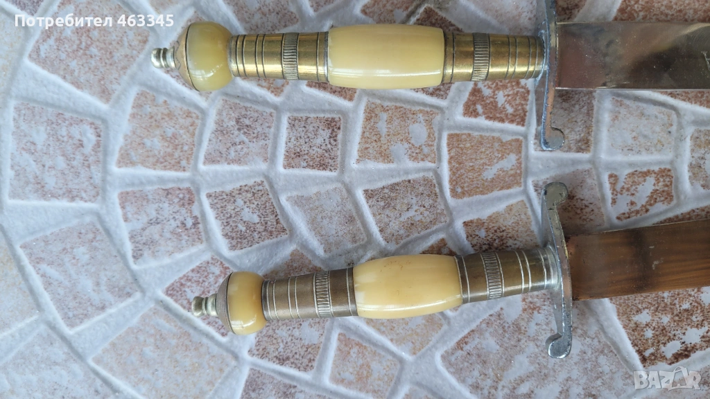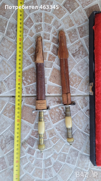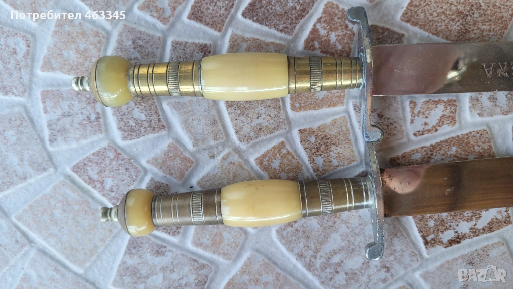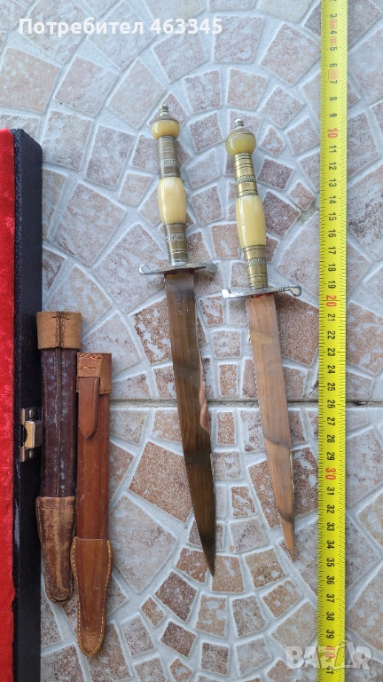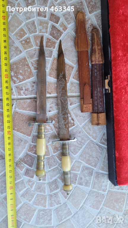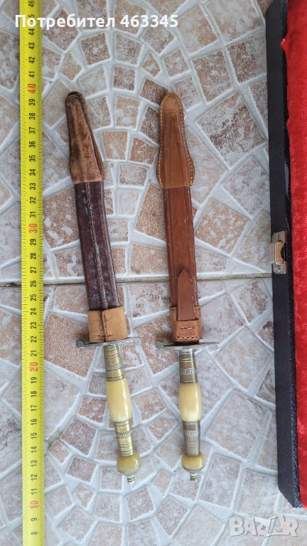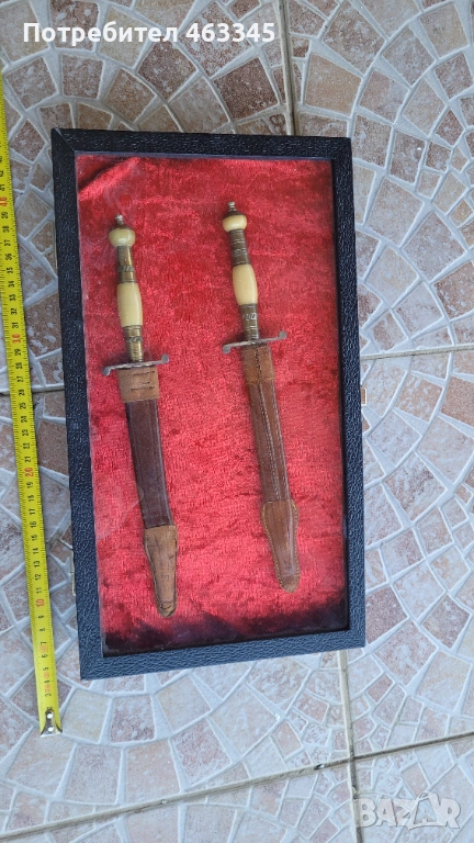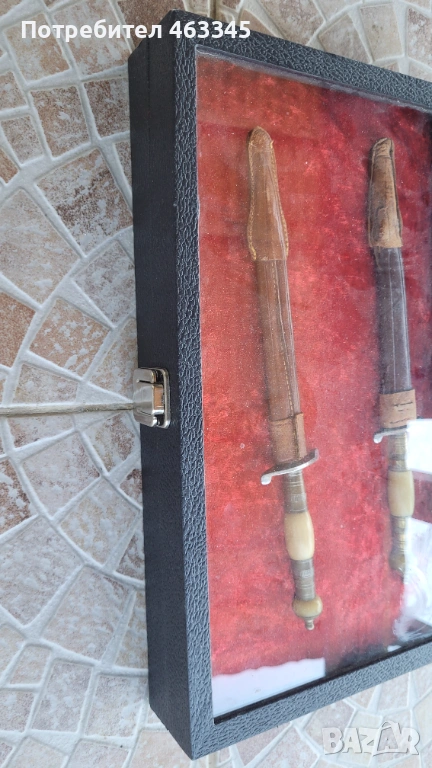 Възпоминателни, бразилски, командоски ножове във витрина. Ножовете са на Pernambucana и са от много качествена стомана. По принцип тези командоски ножове са правени от немци и са подобни на вид немски ками. От едната страна двата ножа са маркирани и украсени. Налични кожени кании в много добро състояние!!