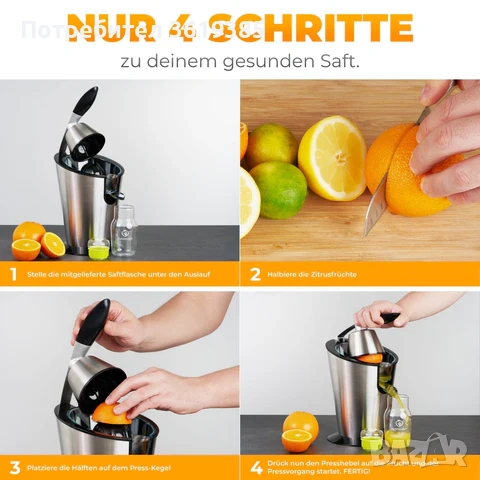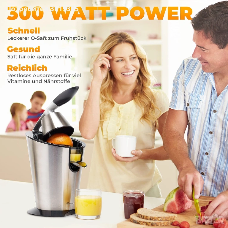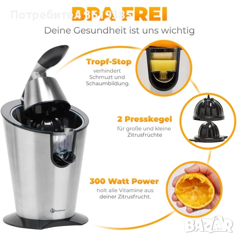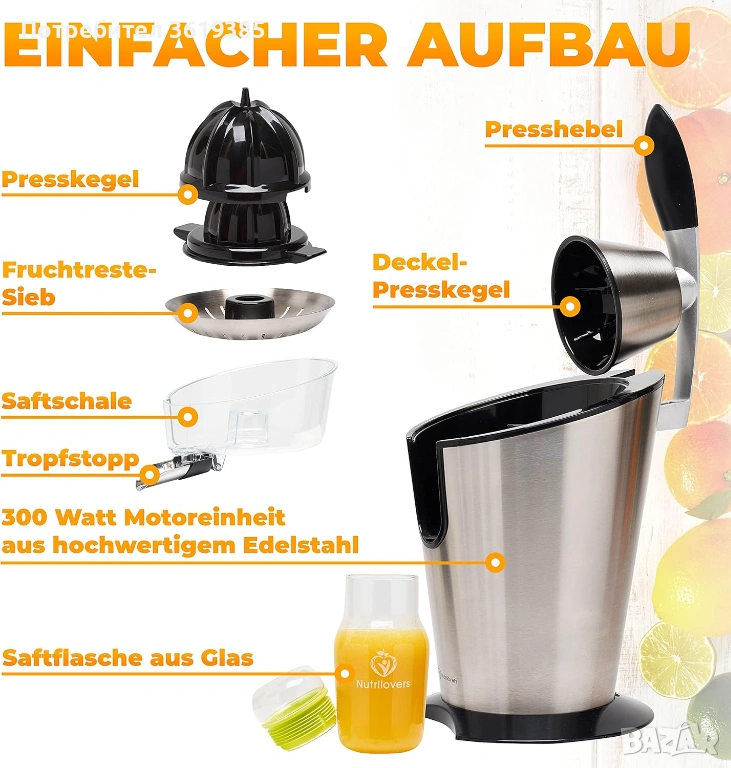 Специална функция - 2 конуса за изцеждане: за малки и големи цитрусови плодове, цедка за плодове от неръждаема стомана 304, материали без BPA, висококачествен дизайн от неръждаема стомана, книжка с рецепти (печатна версия) на немски език, мощен и тих 300-ватов мотор, произведен от Nutrilovers - немска марка, части, подходящи за съдомиялна машина, система против прокапване (предотвратява образуването на замърсявания и пяна).