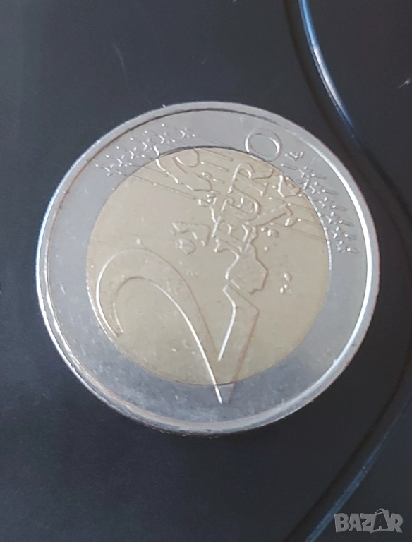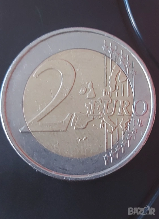 Оигинална евромонета 2 евро от 2002 година, отсечена в монетния двор „F“ (Щутгарт) — част от първите емисии на еврото в Германия.