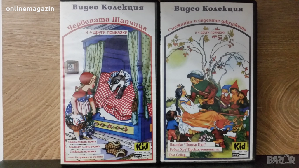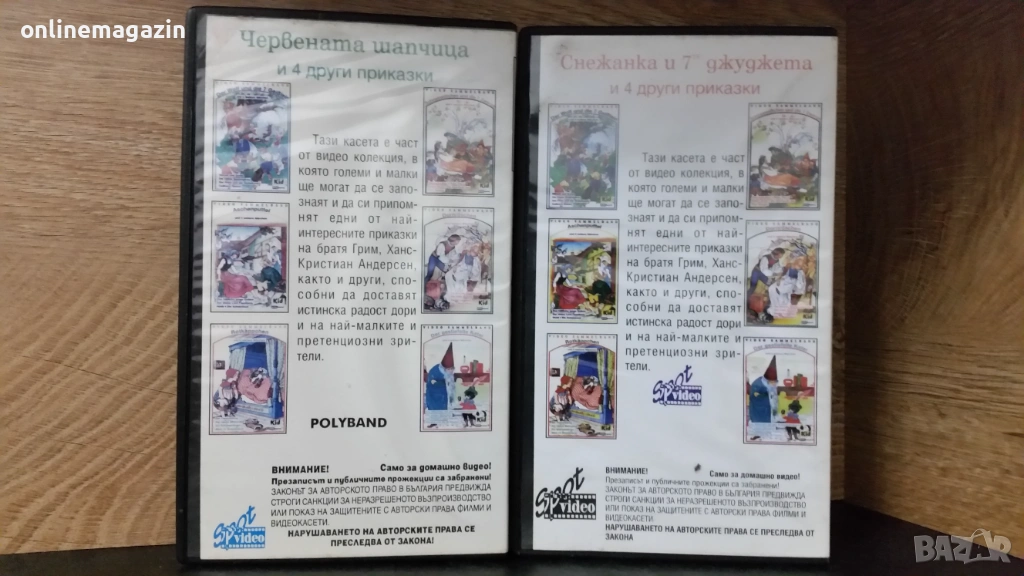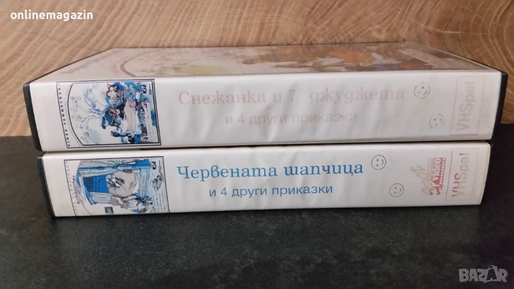 Продавам две оригинални видеокасети с едни от най - популярните детски приказки по цял свят " Червената шапчица + още 4 други приказки - Омагьосаният принц , Малкият оловен войник , Снежната принцеса и Алиса в страната на чудесата. В другата касета освен Снежанка и седемте джуджета има още 4 други приказки - Палечко, Питър Пан , Робин Худ и Приключенията на Том Сойер. Общо 10 приказки в двете видеокасети. Касетите работят отлично и са озвучени на български език. Това са едни от най- интересните приказки на братя Грим и Ханс-Кристиан Андерсен. Двете касети се продават заедно. Изпращам с Еконт или Спиди . С Еконт изпращам с 10% отстъпка от цената на доставката. Отговарям бързо на съобщения. Обща цена 15 евро .