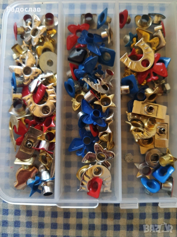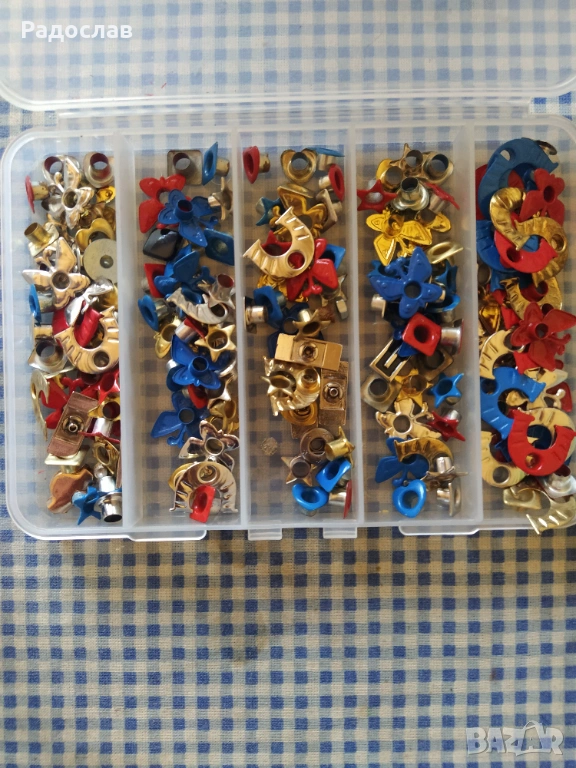 Клещи и разноцветни капси за поставяне на чанти , обувки , дрехи и други.