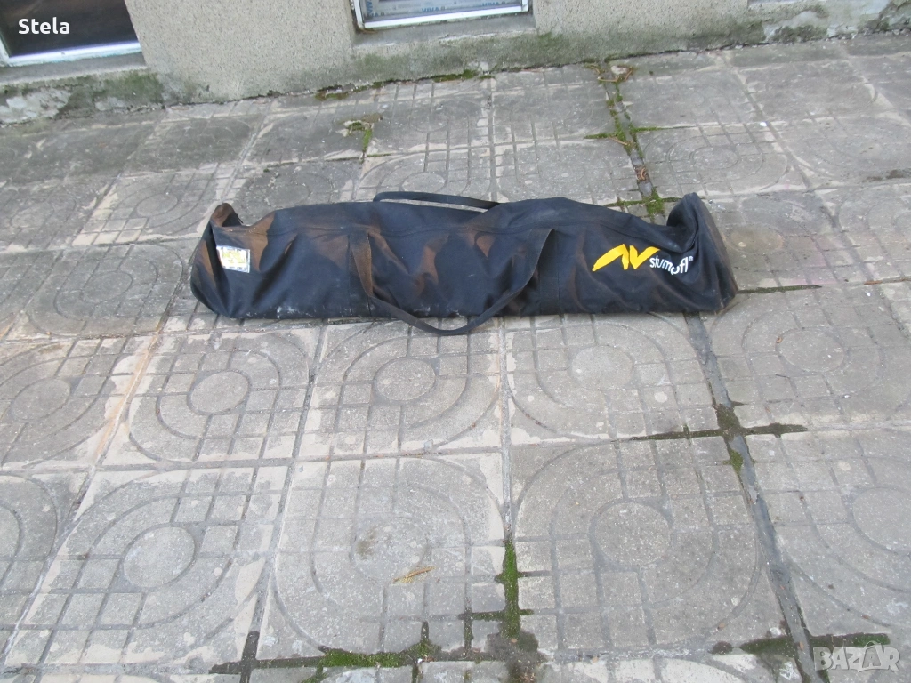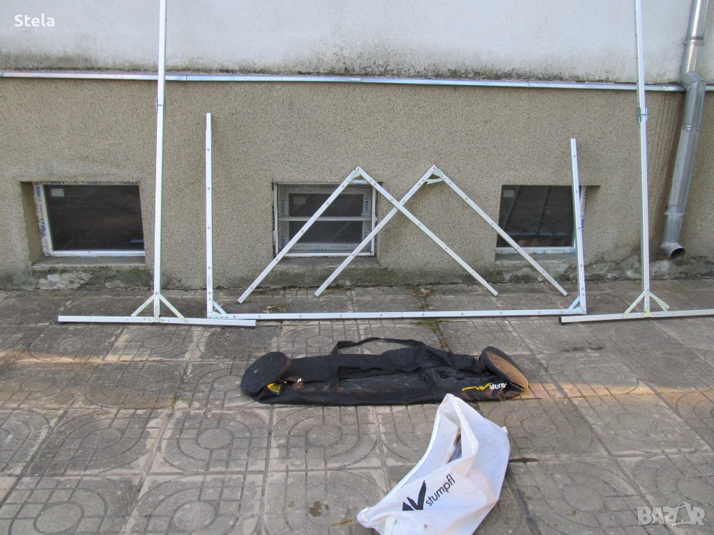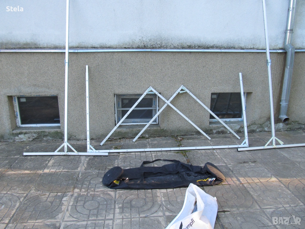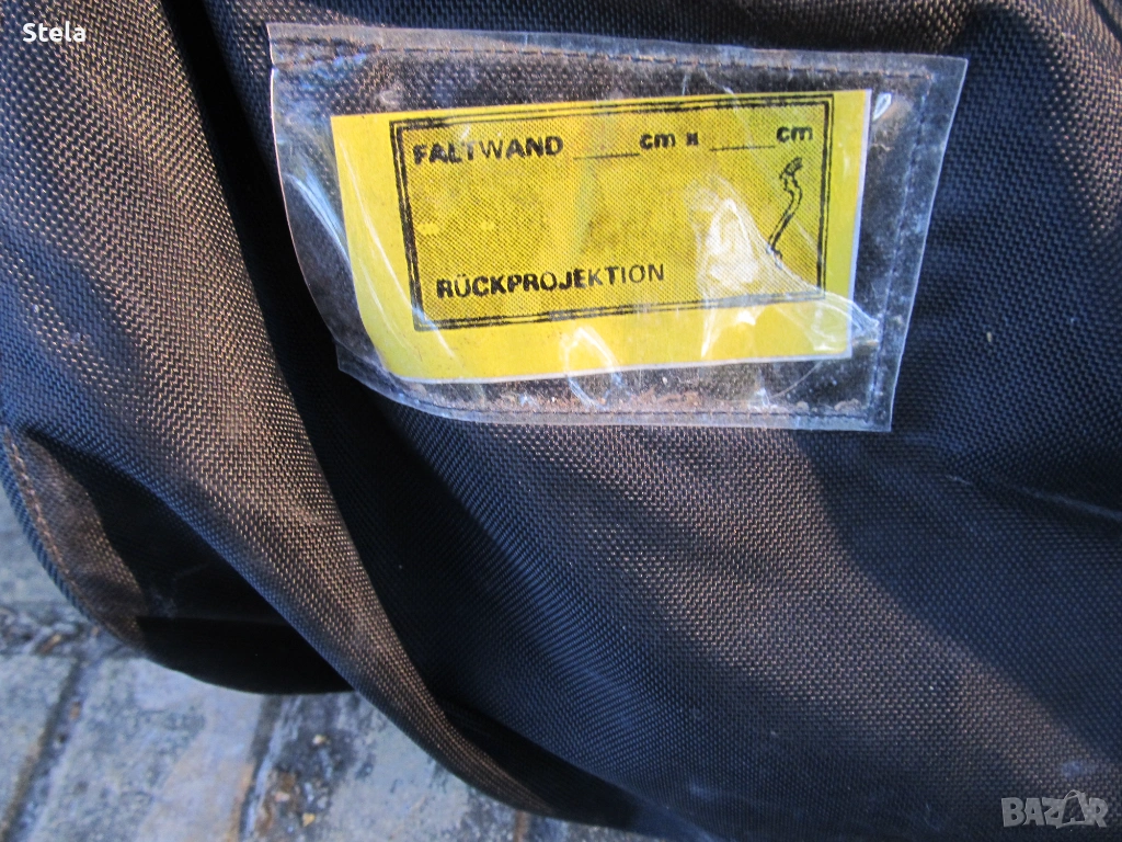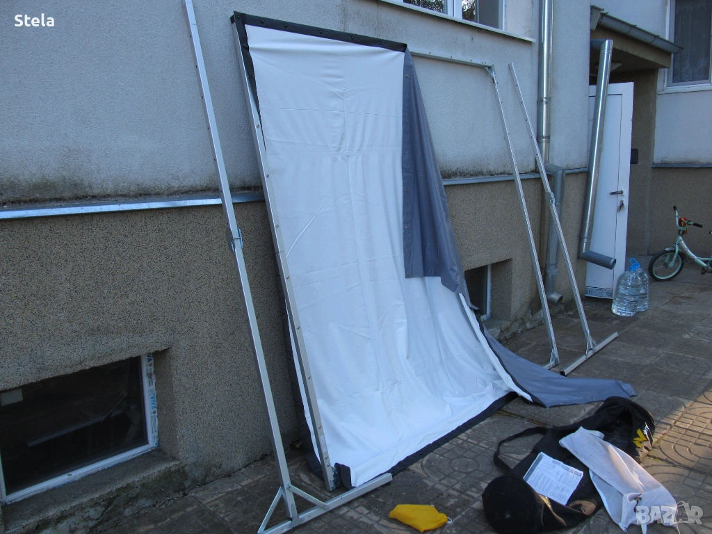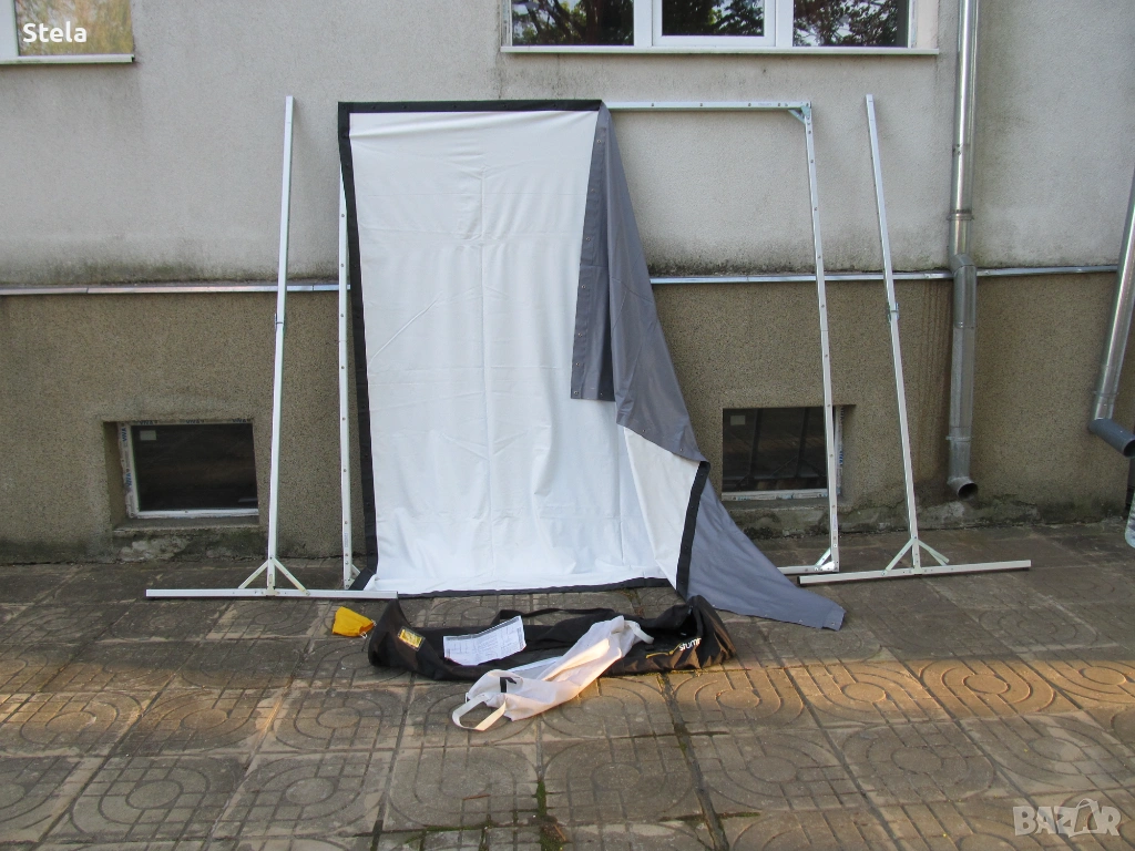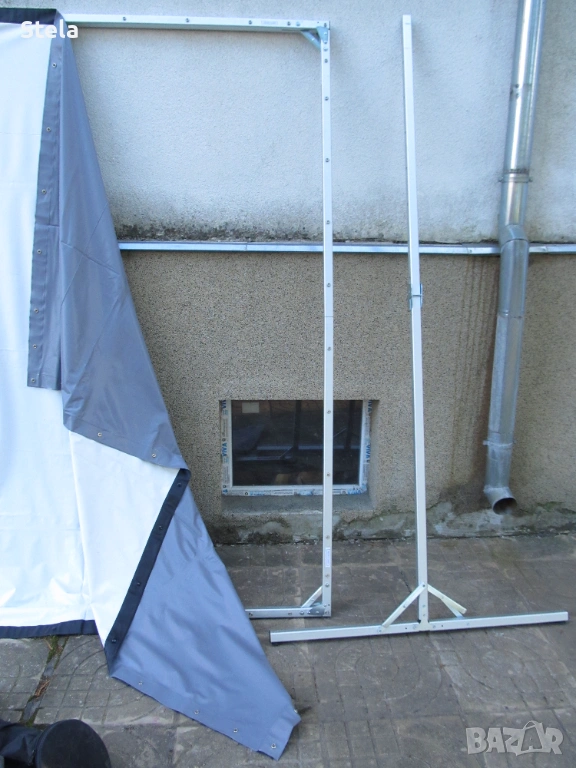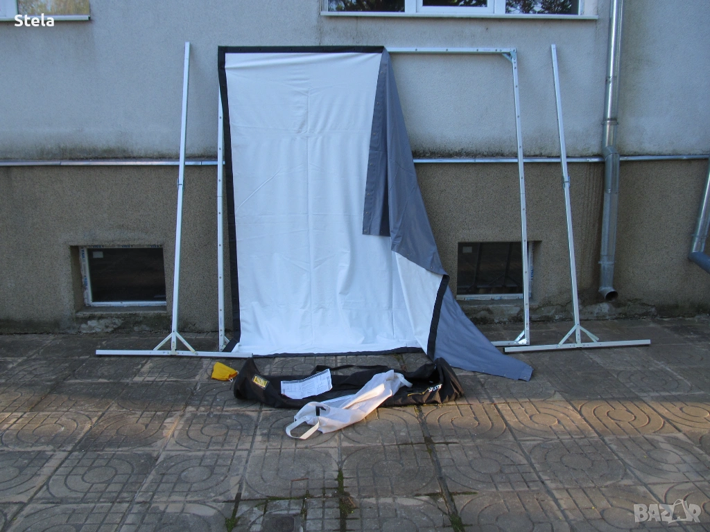 Проектор екран - алуминиева конструкция. Комплект с платнище , събрано в два сака. Внос Германия. Възможно е да му се намери и друго приложение. Тежи към 12-13 кг.