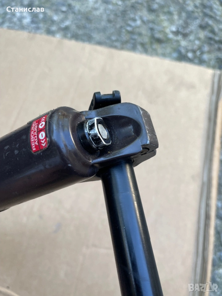 вилката държи въздух и рибаунда работи без проблем, хода е 100мм., вилката е с 20мм., предна ос, единствената забележка е долу където се завива оста/ има пукнатина, няма проблем с карането/