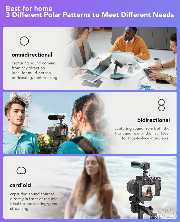 Три режима на запис: Микрофонът AM10B предлага три различни режима на запис, които могат да се превключват чрез удобен бутон отпред: всепосочен (идеален за записи с няколко души), кардиоиден (перфектен за подкастъри, стриймъри на игри и вокални записи) и двупосочен (за разговори между двама говорители, обърнати един към друг). Тези различни режими на запис позволяват разнообразни сценарии на приложение и добавят професионален щрих към съдържанието на създателите.