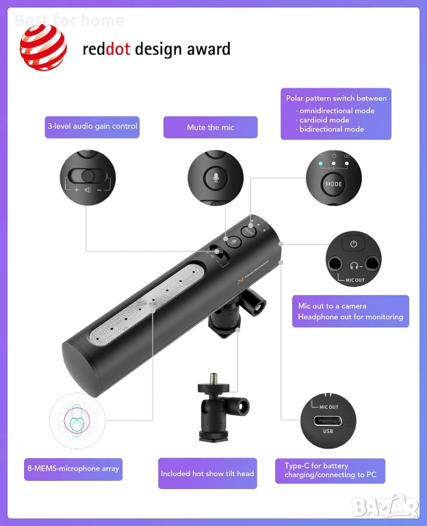 Награди Reddot Design 2023: AM10B камера/USB микрофон впечатлява с невероятно лекия си дизайн, тежащ само 110 грама и с изключително тънък и компактен профил с дебелина по-малка от 1 см. Той е идеалното допълнение за всеки DSLR или видеокамера, разполагащ с интуитивно управление и вградена батерия, което го прави изключително лесен за употреба. Просто свържете микрофона към камерата си и започнете да създавате съдържание веднага.