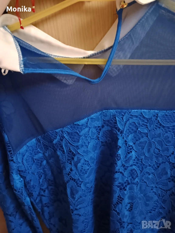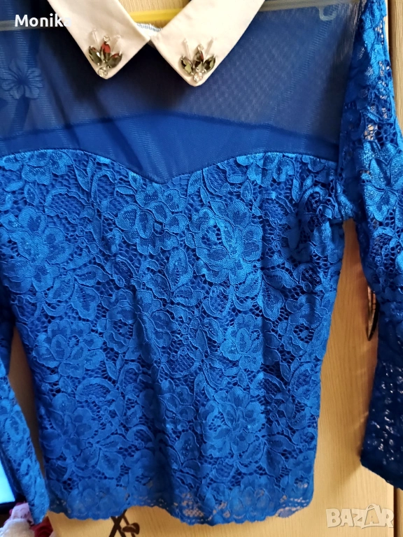 Официална дантелена риза в син цвят. Подходяща за специални поводи и официални събития. Елегантен модел със завършен дизайн.