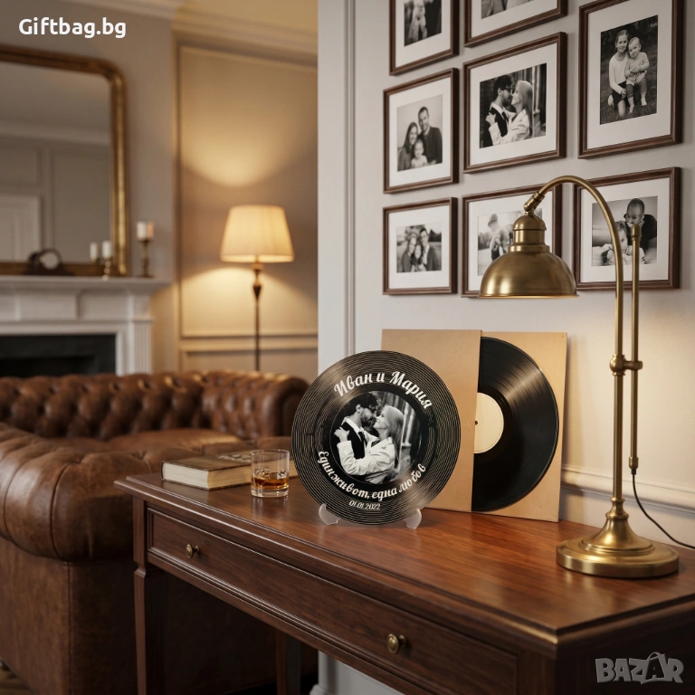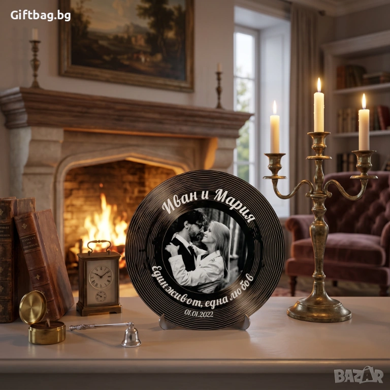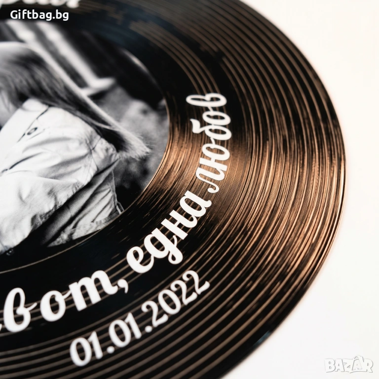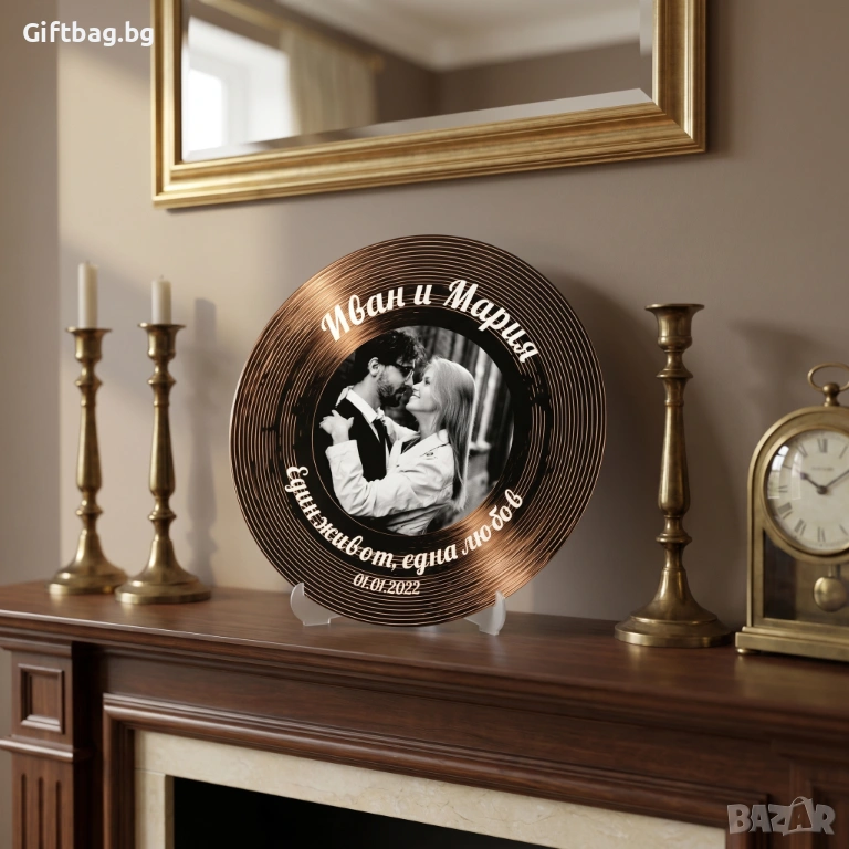 Черно-бялата снимка. Златистите отблясъци. Вечният танц. Тази персонализирана дървена плоча е за онзи специален момент, когато времето спира – две души, една прегръдка, една история. Дълбоко черният винилов фон с деликатни златисти преливки превръща обикновената снимка в сцена от филм на Хичкок.