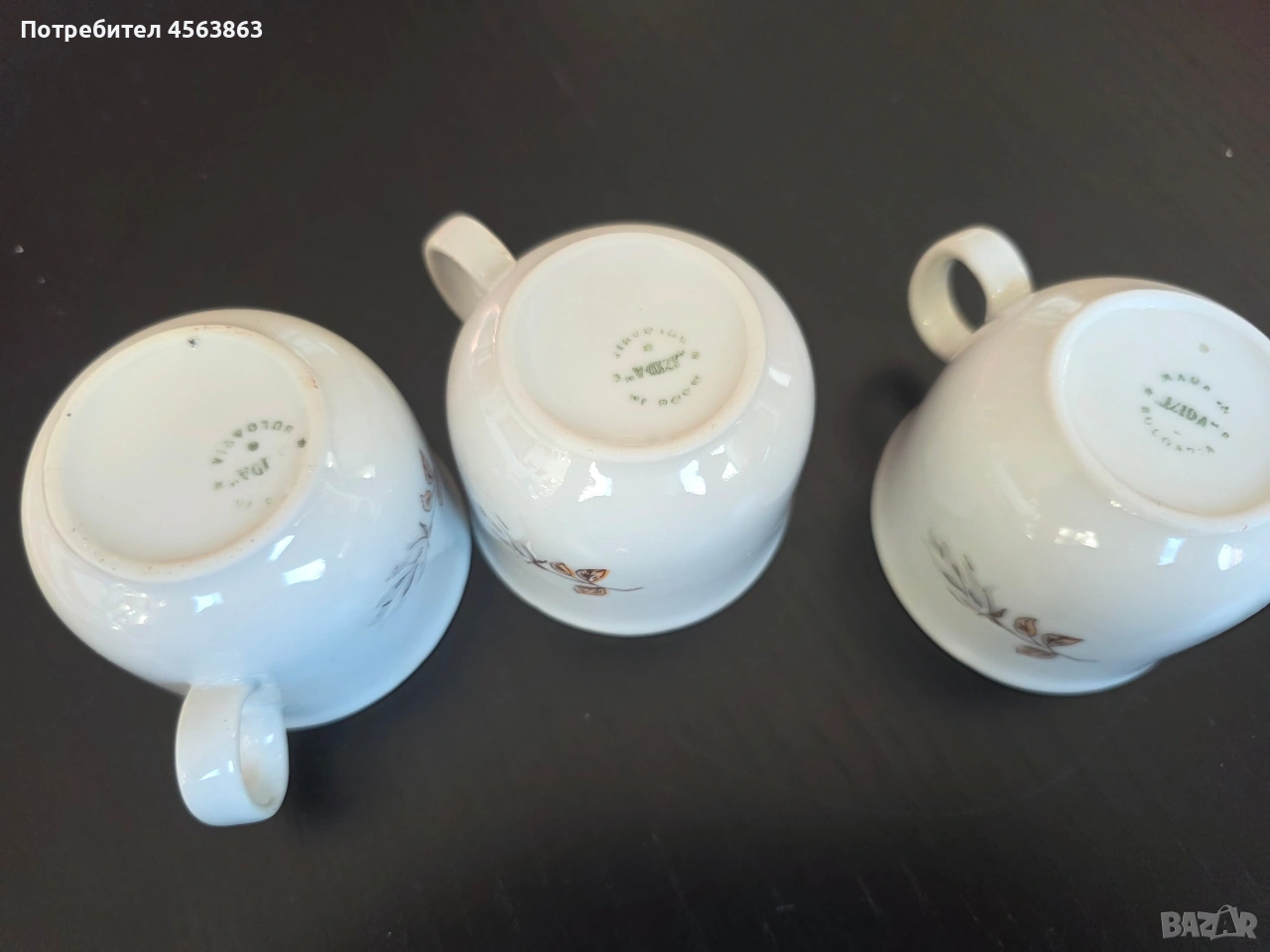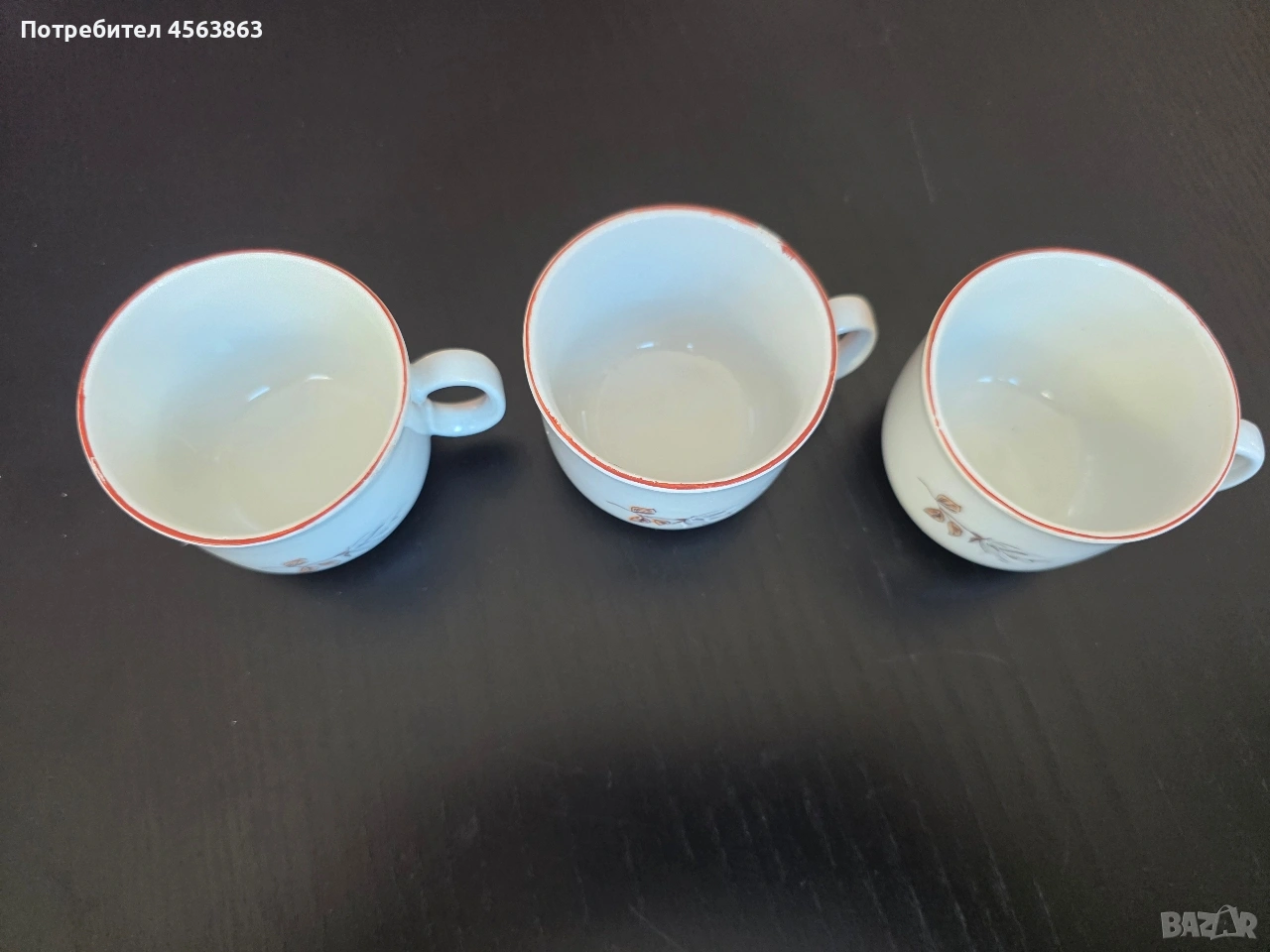 Сет от 3 чашки за кафе, с двустранна декорация. Незначителен пропуск на канта на 1-та чашка.