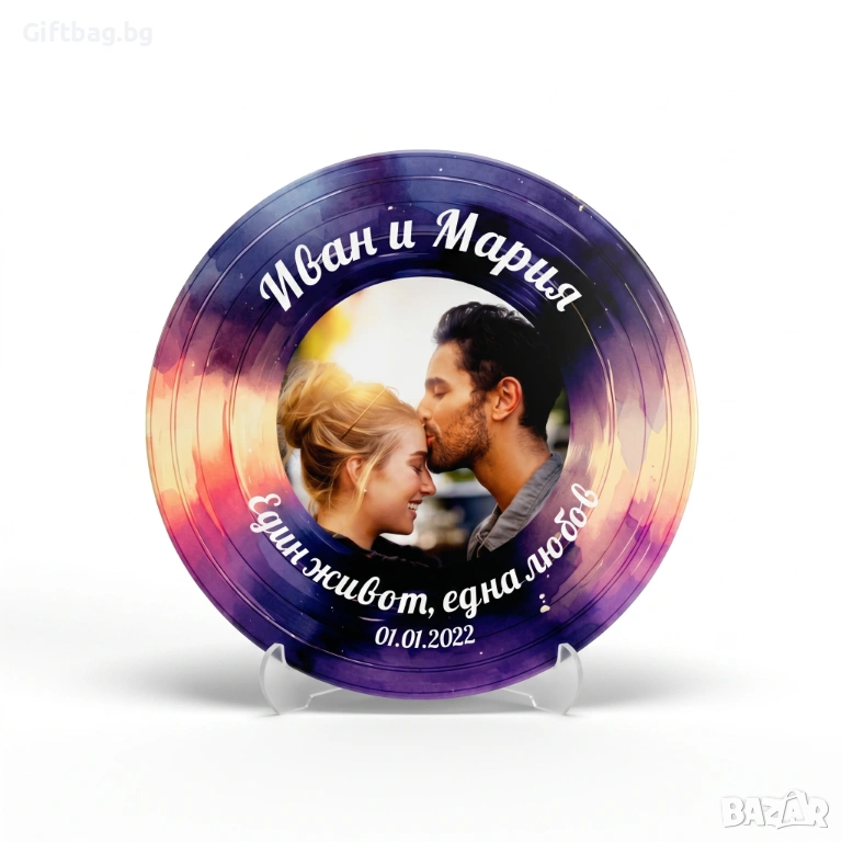 Любовта е като залез – винаги различна, винаги красива. Тази персонализирана дървена плоча улавя вълшебството на онзи час, в който денят среща нощта. Дълбоки лилави, нежни розови и топли оранжеви тонове се преливат в мистичен винилов мотив, създавайки фон, достоен за най-красивия ви спомен.