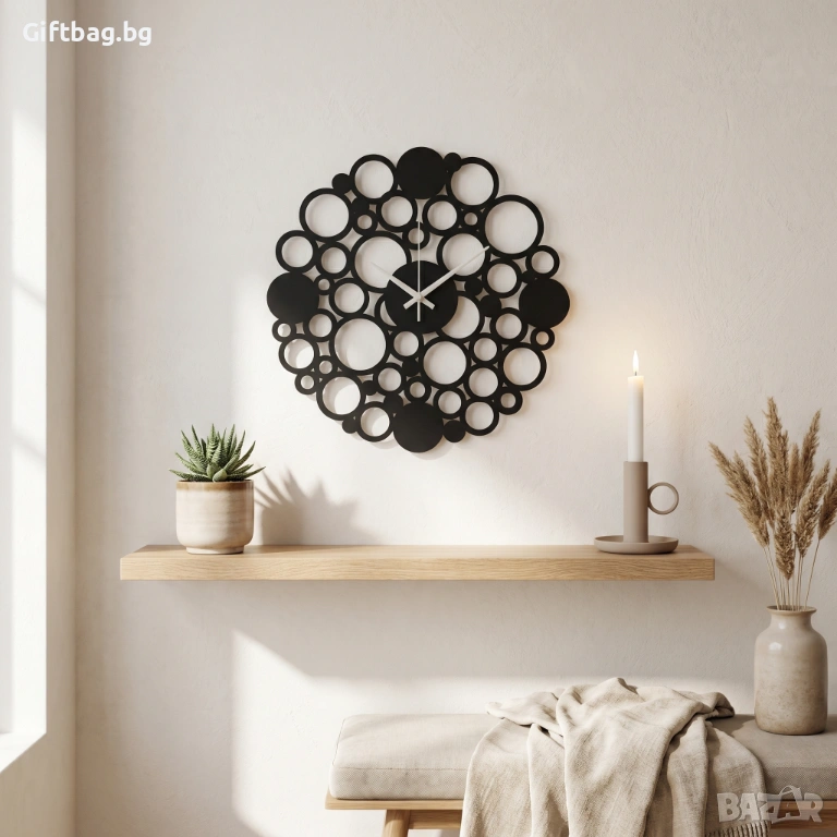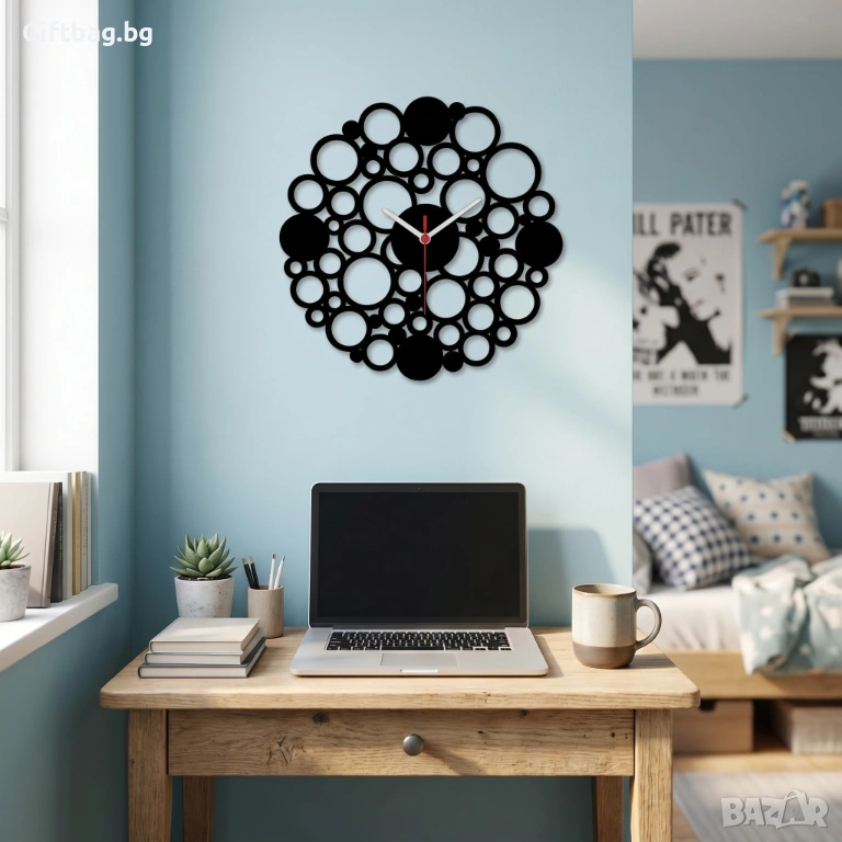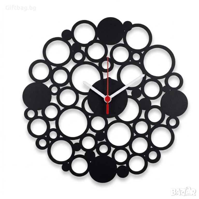 Време, което кипи от живот. Този стенен часовник е като замразен миг от танца на мехурчета – десетки кръгове с различни размери се преплитат в органична композиция, създавайки хипнотичен абстрактен ефект. Без цифри, без правила – само чиста геометрична поезия.
