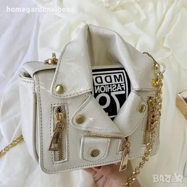 лачена чантичка, мини чанта бяла, чанта яке дизайн, чанта с верига, малка дамска чанта, бяла лачена чанта, чанта с ципове, модна чантичка, дамска чанта златна верига, чанта България, стилна мини чанта, уникална чанта