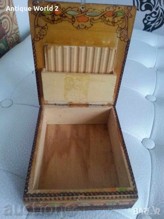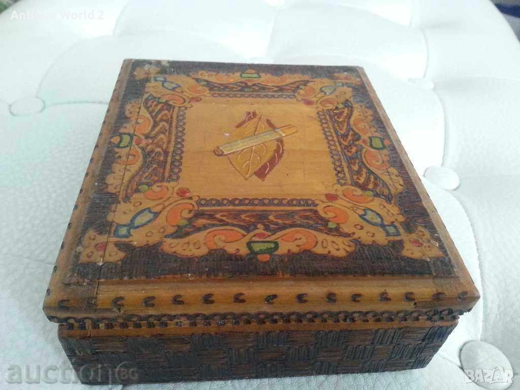 Стара Красива Дървена Пирографирана Кутия, Цигаретник.Размери : Широчина 130мм, Дълбочина110мм,Височина 45мм.