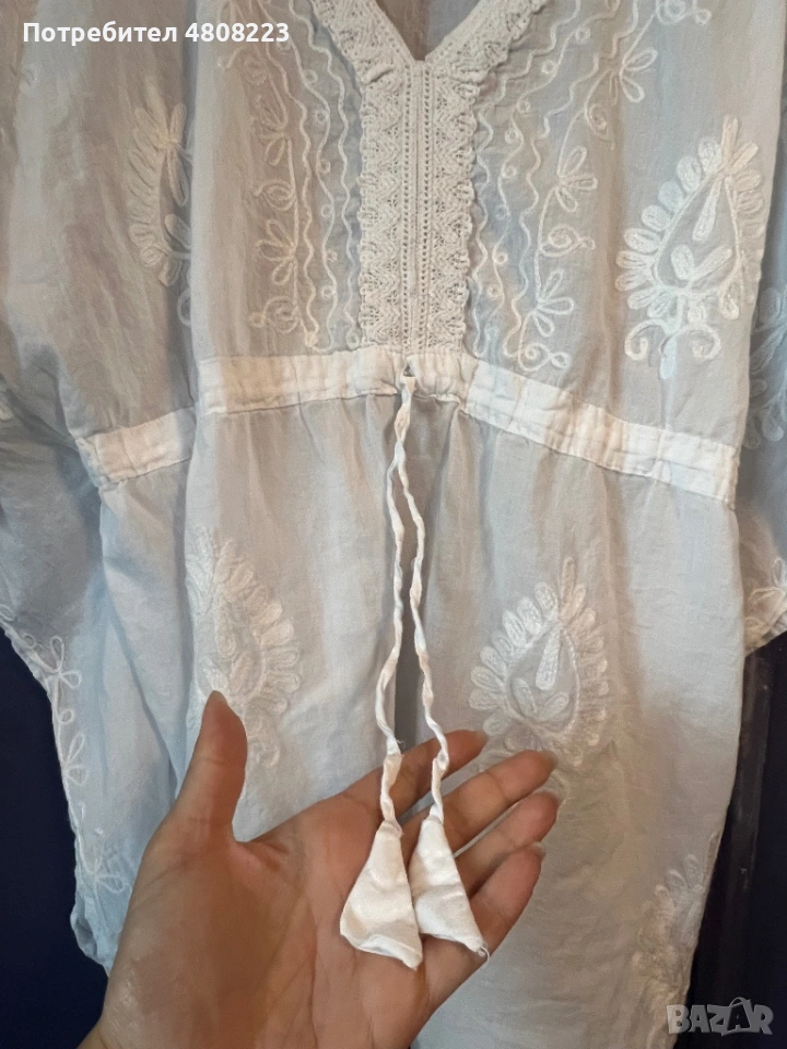 Тъника от 100% памук с бродерия. Лека ефирна материя. Ластик на гърба, връзка за затягане отпред. Дължина 70см