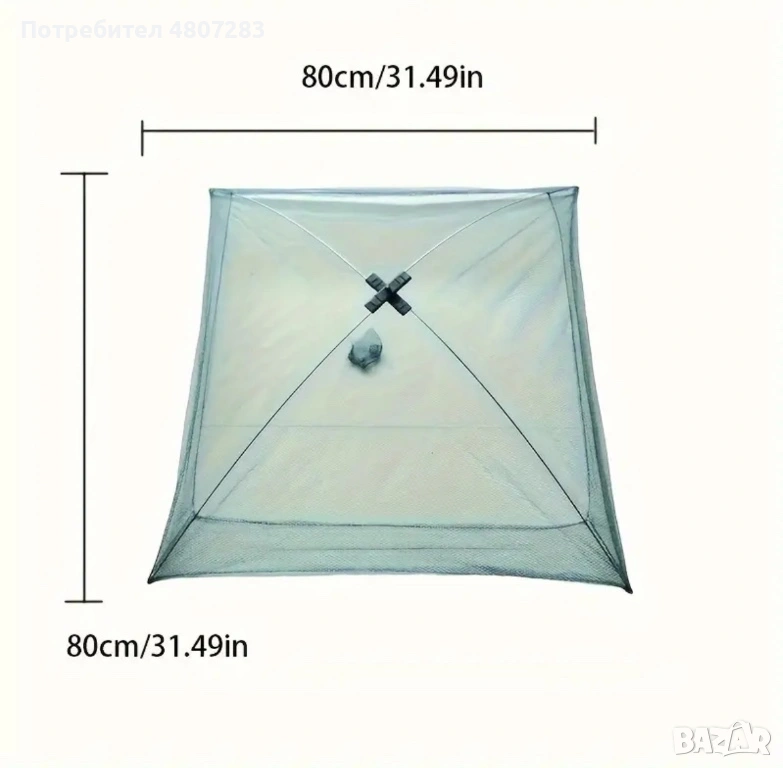 С размер 80×80 см, той предлага достатъчно пространство за улов и е подходящ за различни видове водни обитатели. ✅