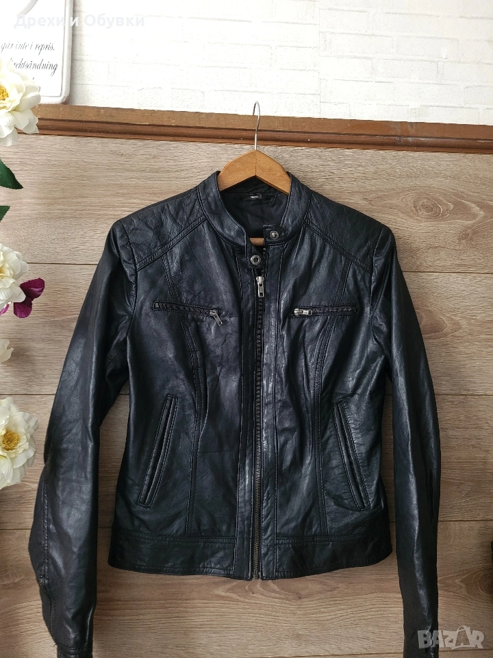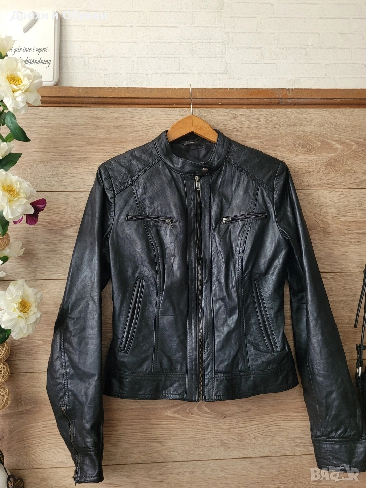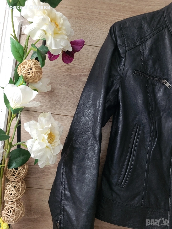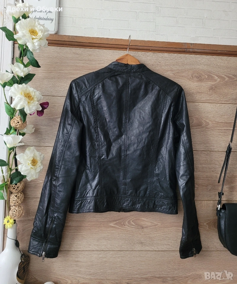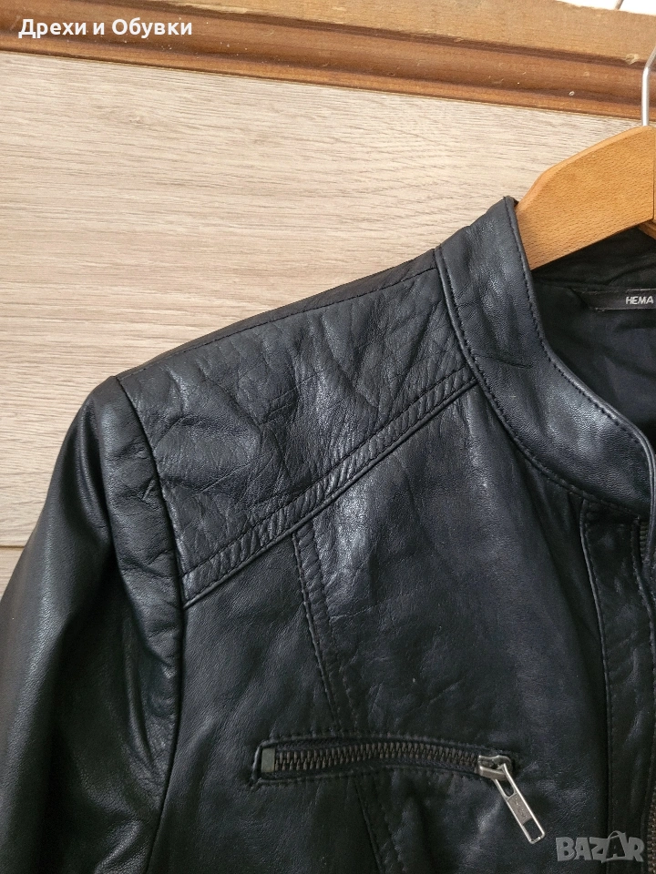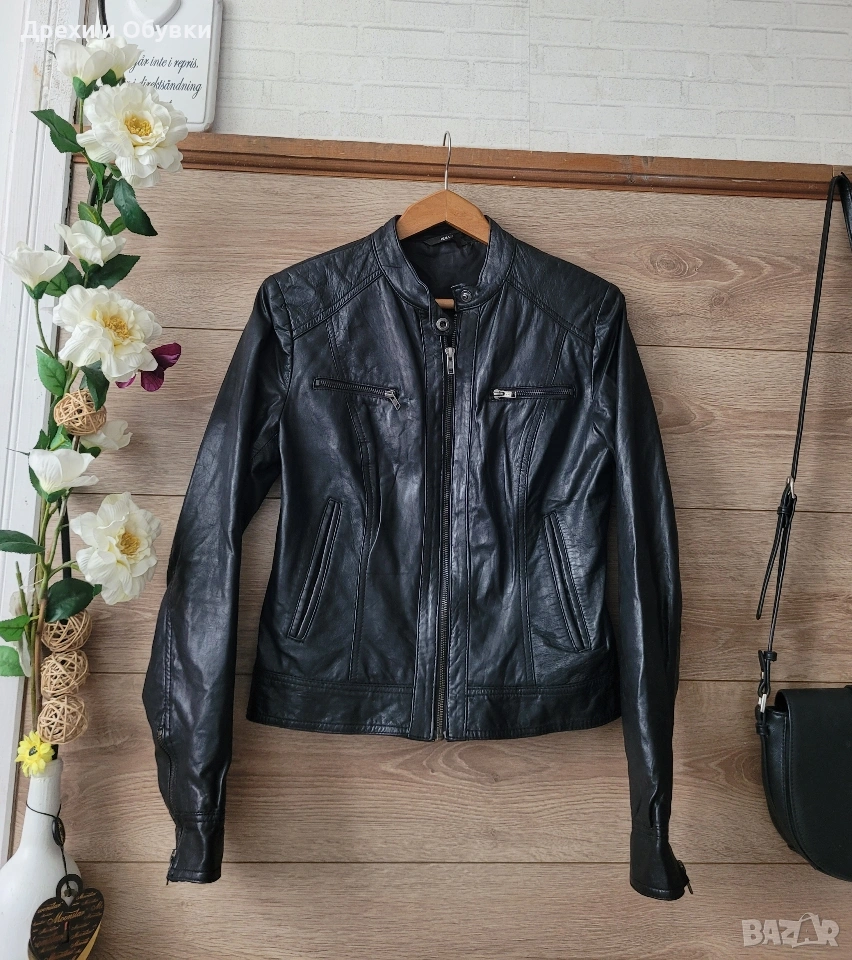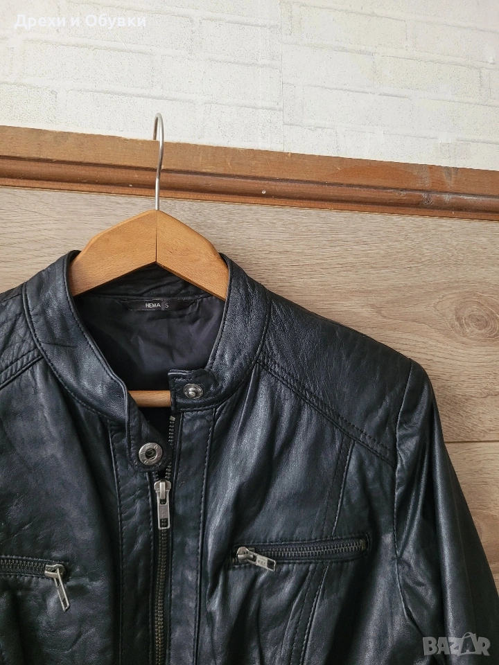 Стилно дамско яке от естествена кожа Hema в класически черен цвят. Моделът е с изчистен и елегантен дизайн, с цип отпред и на ръкавите. Два странични джоба и два с ципове Подходящо както за ежедневие, така и за по-елегантни визии. Размер: S, но е подходящо и за M Мерки: дължина 54см, гръдна 98-100см Състояние: много добро, без забележки Перфектен избор за сезон пролет/есен или по-хладни летни вечери. Цена 42€