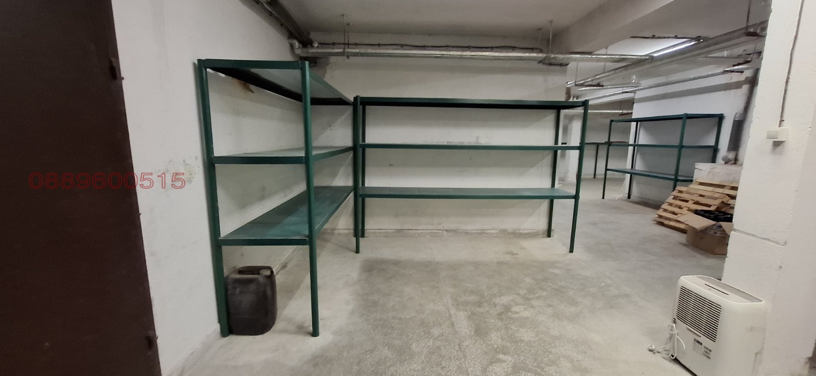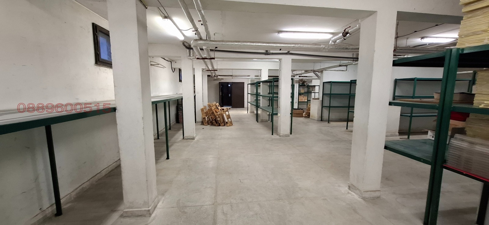 5. Склад - 230 кв. м, на кота -3м., с предверие и тоалетна. Внасянето и изнасянето на стоки от склада се извършва с помощта на товарен асансьор. Складът поддържа постоянно хладна температура и е подходящ за стоки, чувствителни на светлина и топлина. Има възможност за наемане и на съседни прилежащи помещения. В цената са включени и 2 паркоместа. Цена 6 евро/кв.м.