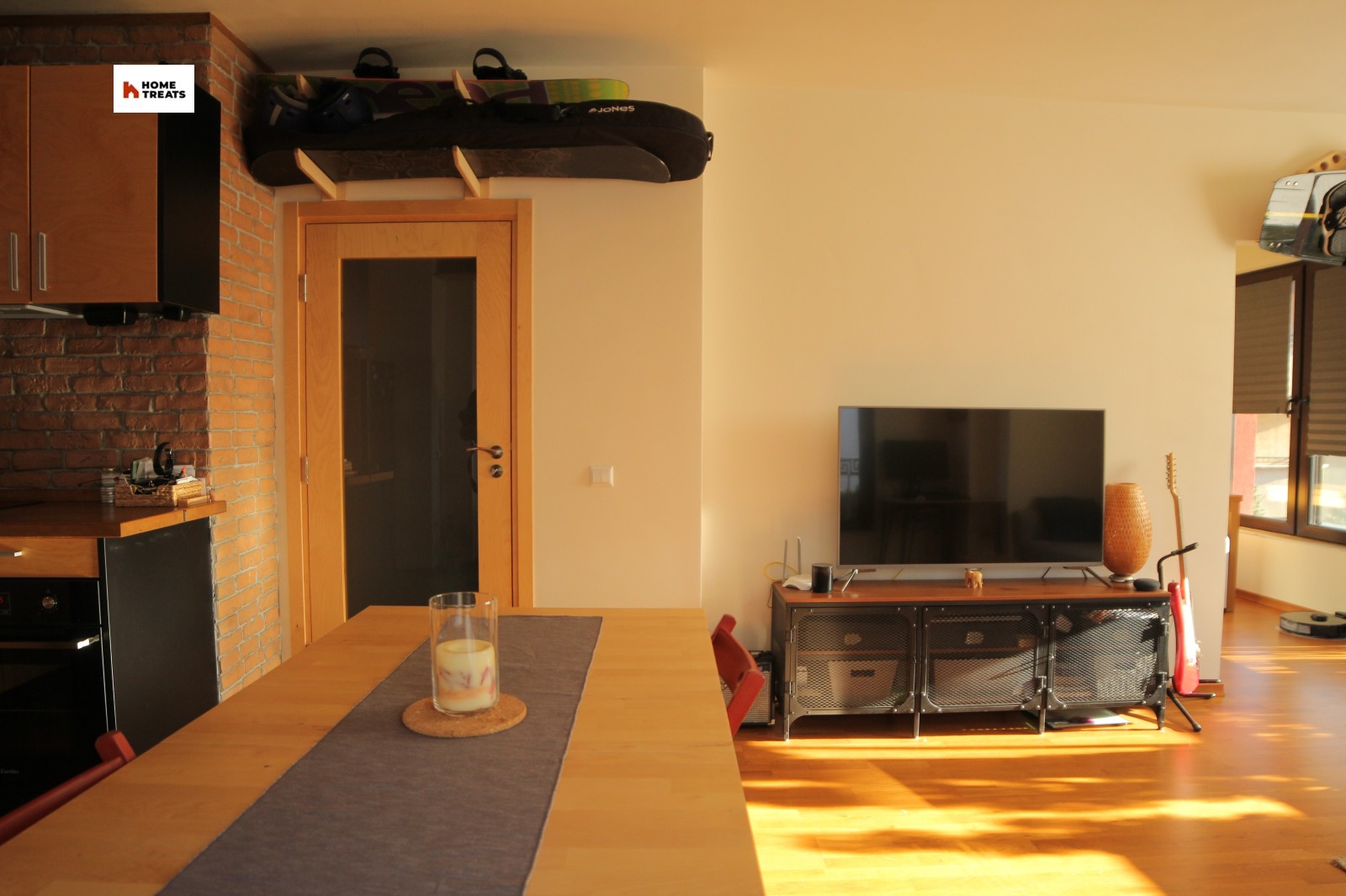 The apartment is warm and sunny with mostly southern exposure. It consists of a living room with a fully equipped spacious kitchen and dining room, а bedroom, a corridor/hallway, a terrace and a bathroom with a toilet. High-quality materials are used in the interior as: oak parquet, oak countertop, birch plywood, a hyperinverter AC unit with Wi-Fi.