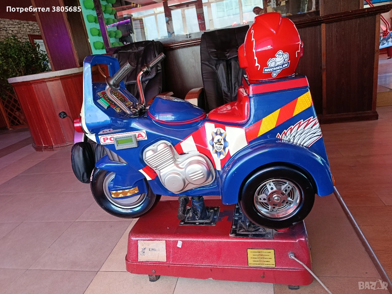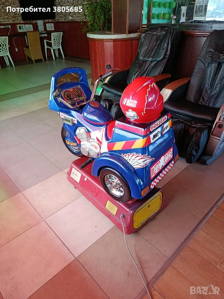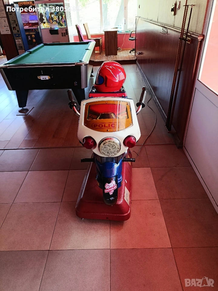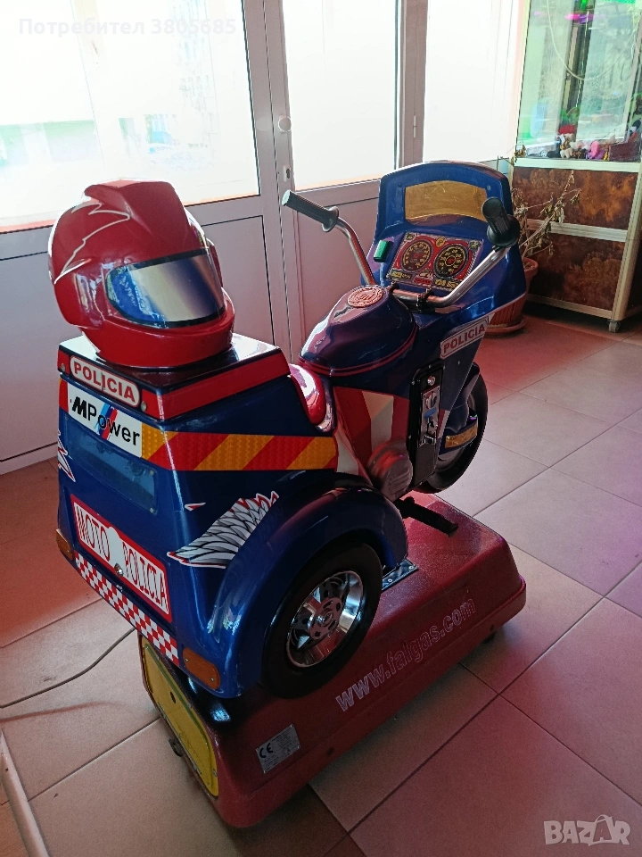 Продава се детска клатушка - полицейски мотор. В добро техническо състояние, работи отлично. Може да се настрои с монета по Ваш избор.