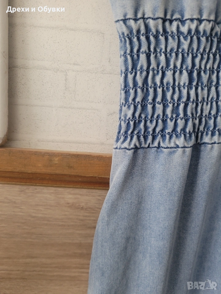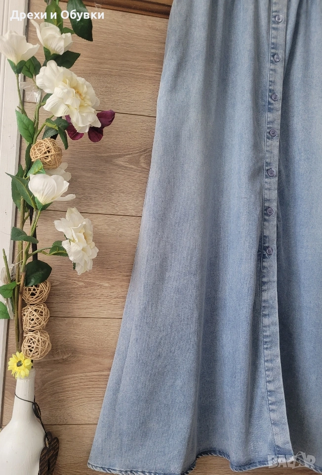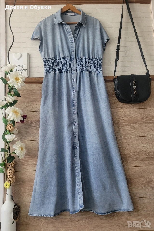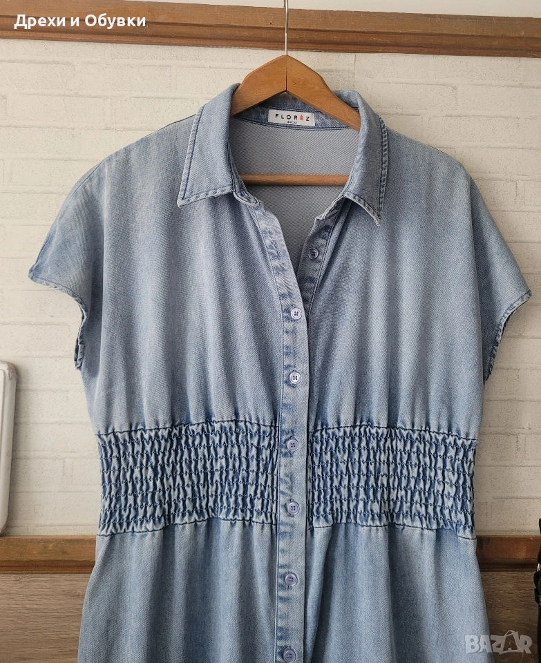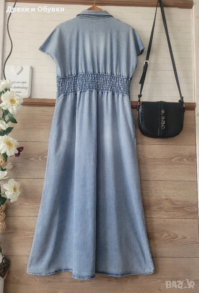 👗 Дънкова рокля FLOREZ с джобове Стилна и удобна дънкова рокля с копчета по цялата дължина и еластична талия, която подчертава фигурата. Моделът е с къс ръкав и практични странични джобове – перфектна комбинация от комфорт и елегантност. Подходяща както за ежедневието. ✨ Характеристики: • Марка: FLOREZ • Материя: мека и лека деним тъкан • Кройка: свободно падаща, с ластик в талията • Закопчаване: копчета отпред • Джобове: да 📏 Отговаря на размер М Мерки: Гръдна до 100см ( носи се свободно), дължина 130см, талия на широк ластик в свободно положение 42м ( едностранно). ✔️ Без ограничения в раменете ✔️ Състояние: отлично като нова! 💙 Лесна за комбиниране с кецове, сандали или обувки на ток за различни визии. Цена 24€