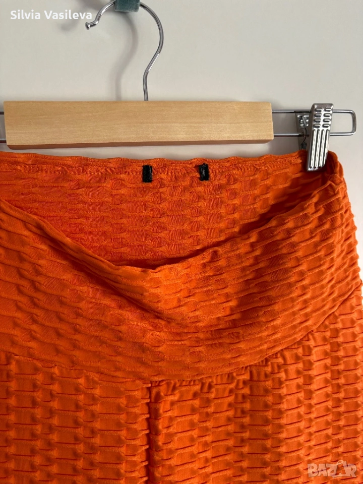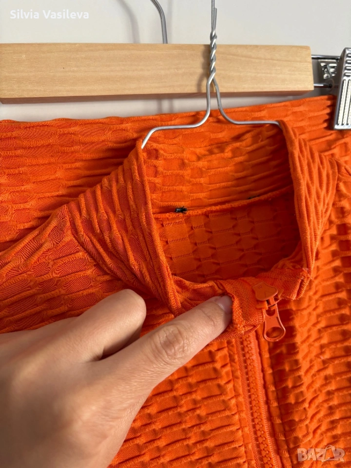Дамски оранжев сет клин и късо горнище размер S изрязани са всички етикети обличан 2-3 пъти клин дълбока талия очертаващ седалището и къса горничка с цип полиестер