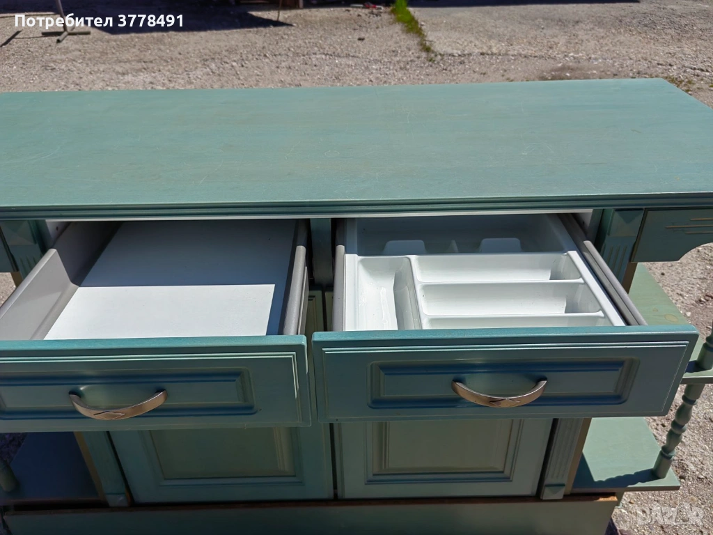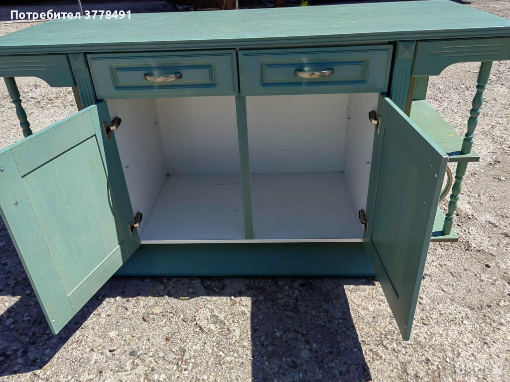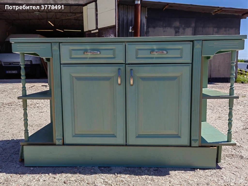 Този красив зелен кухненски шкаф е с два чекмеджета с плавно затваряне и две врати. Шкафът е изработен от качествени материали и има добър дизайн, подходящ за всяка кухня. Плота е от твърд масив и пиластри за украса. Предлага се на изгодна цена и е в много добро състояние, готов за нов дом.