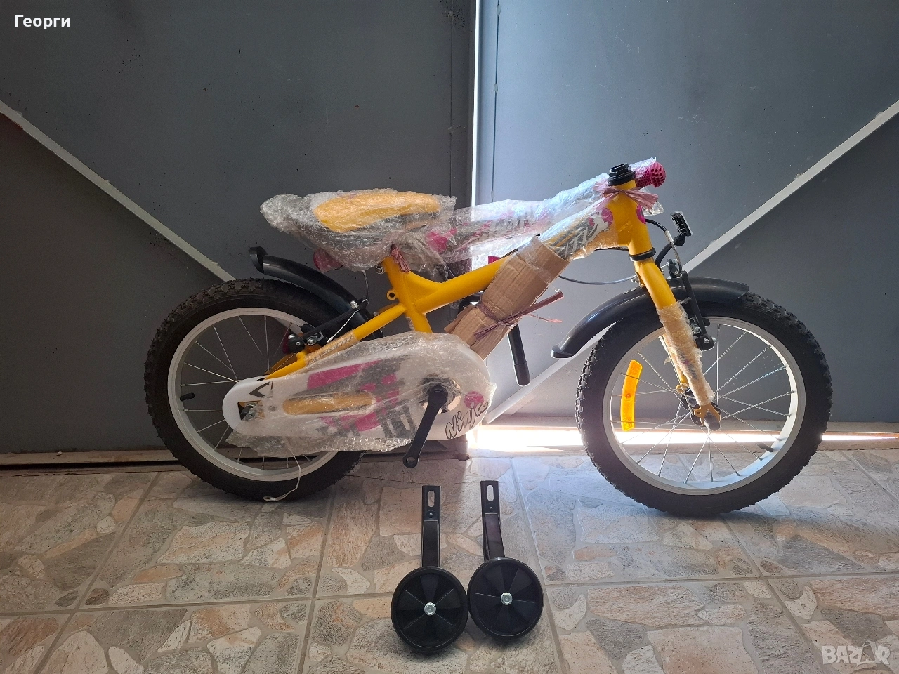Продавам чисто нов детски велосипед Passati Ninja-16 цола в комплект с помощни колела,калници,предна и задна спирачка.Цвят жълто и лилаво,по желание може да бъде сглобен!Цена 110евро. Възможност за Замяна на вашето по малко колело с доплащане от ваша сграна на Място!