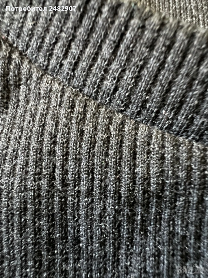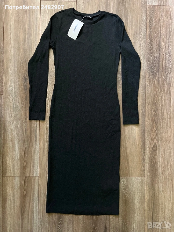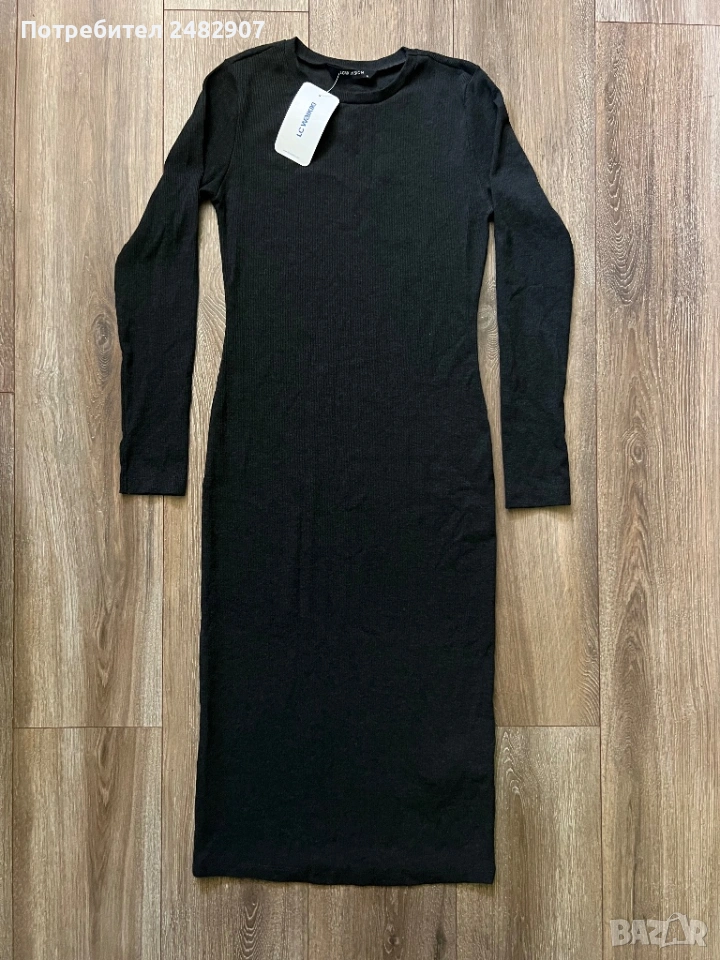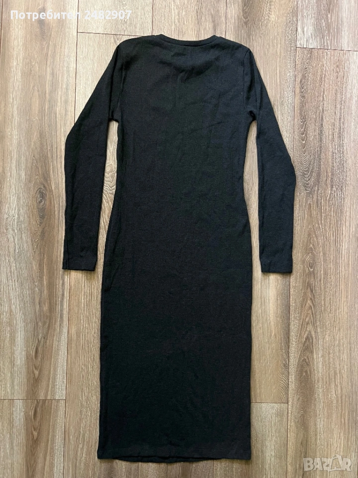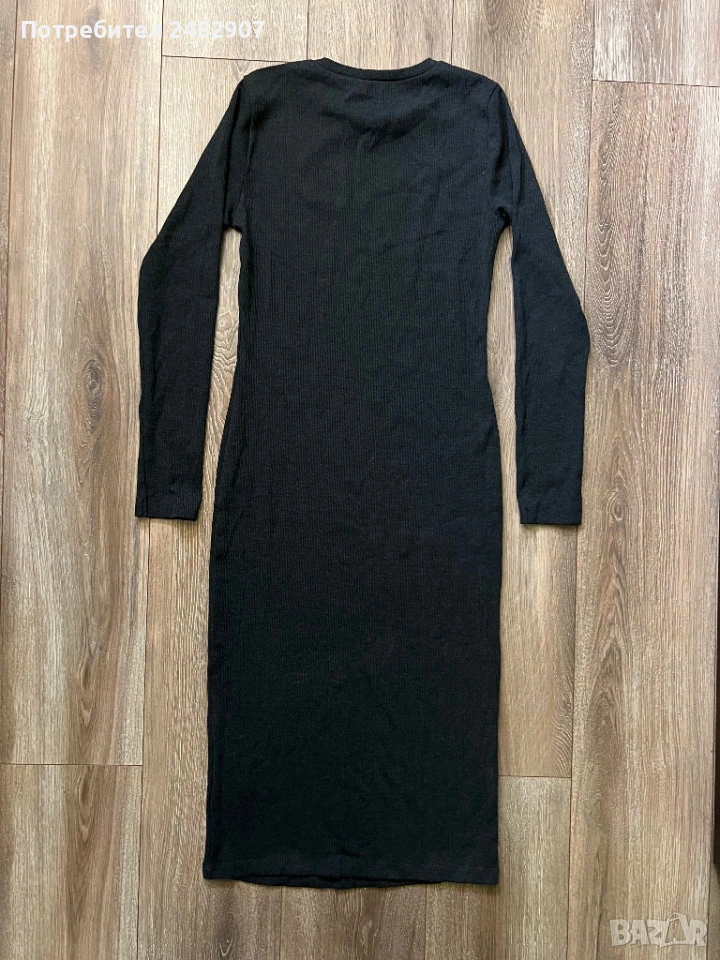 Тъмно сива дамска рокля, размер М. Съдържа 66 % полиестер, 32 % вискоза и 2 % еластан. Ширина в раменете - 35 см, ширина под мишниците - 39 см, ширина в долната част - 40 см, дължина от рамото до долу - 111 см, дължина на ръкава от рамото - 61 см, ширина на ръкава в долната част - 9 см. Чисто нова, не е използвана.