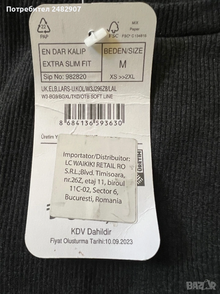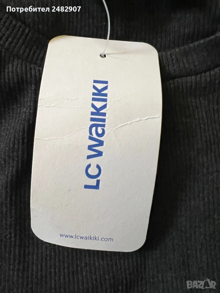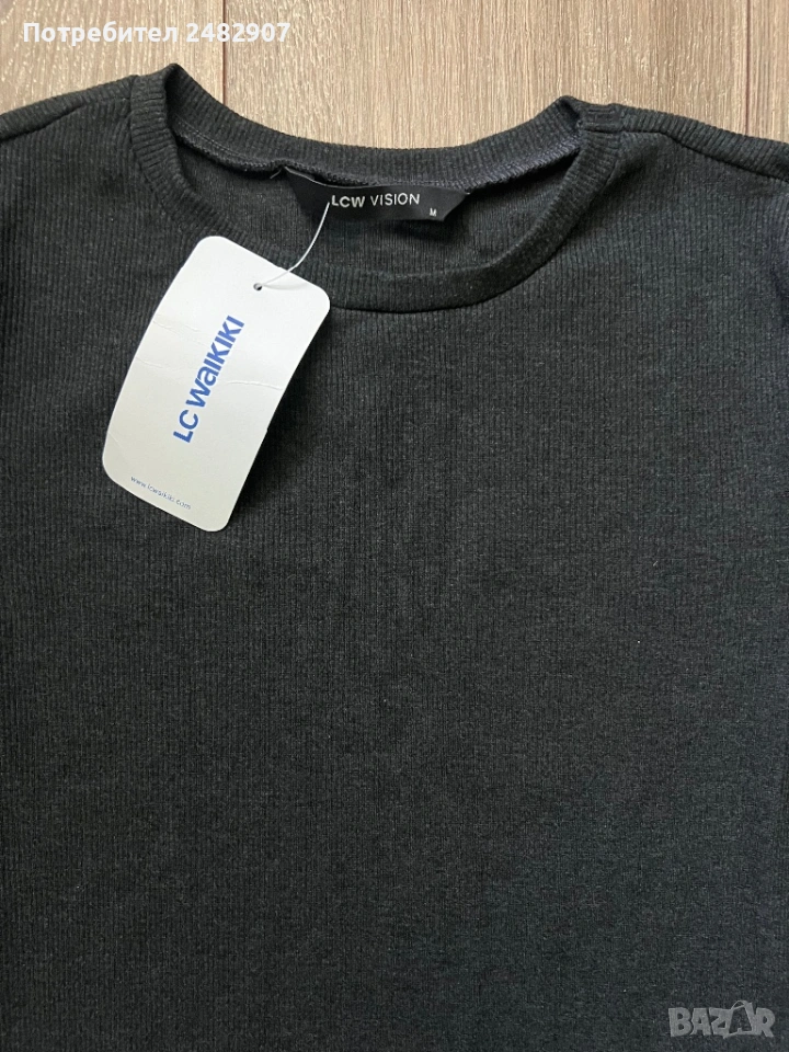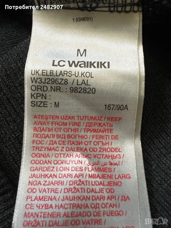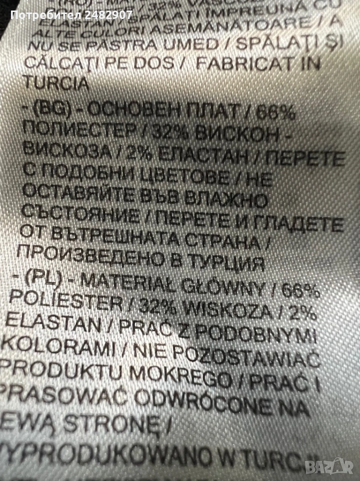 Тъмно сива дамска рокля, размер М. Съдържа 66 % полиестер, 32 % вискоза и 2 % еластан. Ширина в раменете - 35 см, ширина под мишниците - 39 см, ширина в долната част - 40 см, дължина от рамото до долу - 111 см, дължина на ръкава от рамото - 61 см, ширина на ръкава в долната част - 9 см. Чисто нова, не е използвана.