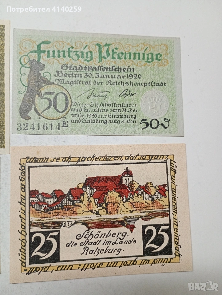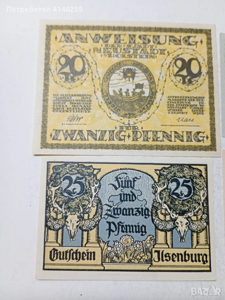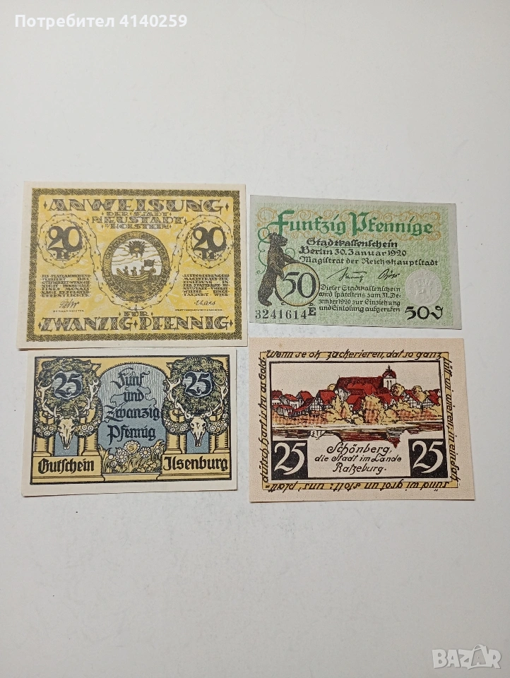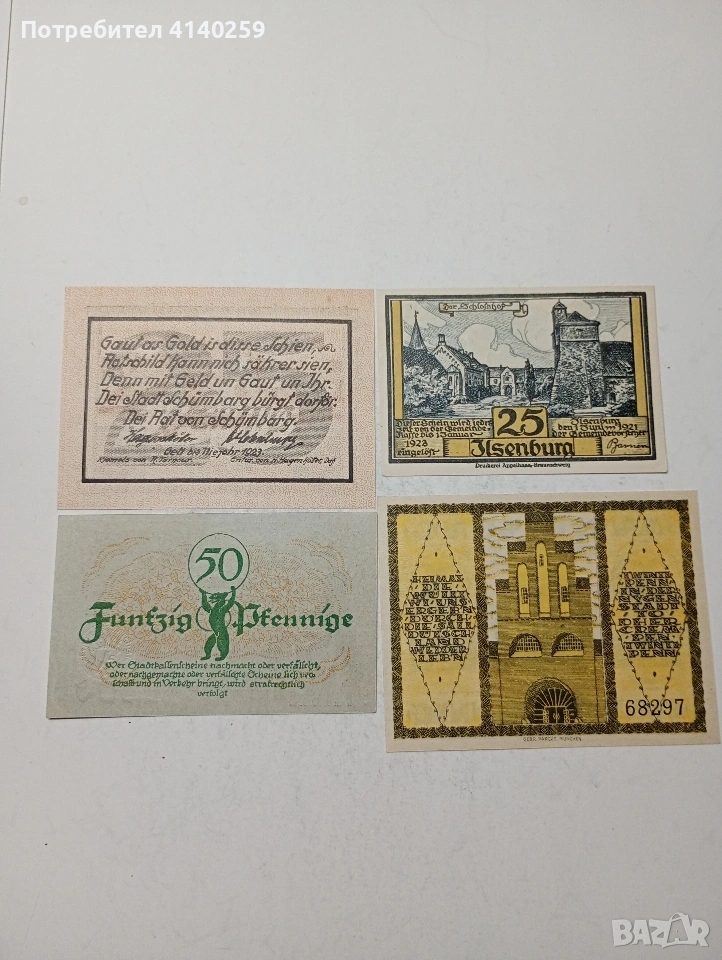 ГЕРМАНИЯ БАНКНОТИ ТИП НОТ ГЕЛ СПЕШНИ ПАРИ 25 ПФЕНИГА ГРАД ШЬОНБЕРГ 1921 Г 25 ПФЕНИГА ГРАД ИНЗЕНБУРГ 1921 Г 50 ПФЕНИГА ГРАД БЕРЛИН 1920 Г 20 ПФЕНИГА ГРАД ХОЛЩАЙН 1921 Г СЪСТОЯНИЕ НОВО ЦЕНА ЗА 4 БРОЯ ПОЛУЧАВАТЕ СНИМАНИТЕ БАНКНОТИ РАЗГЛЕДАЙТЕ ДРУГИТЕ МИ ОБЯВИ ДА КОМБИНИРАТЕ ДОСТАВКА ЕКОНТ ЗА ВАРНА ЛИЧНО