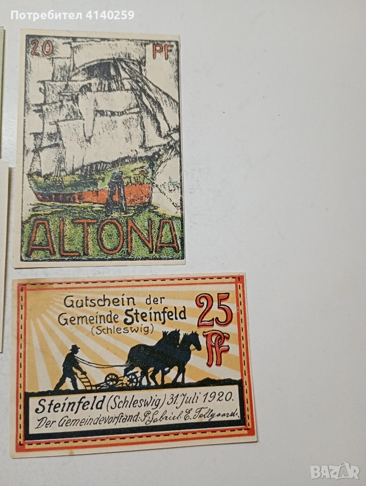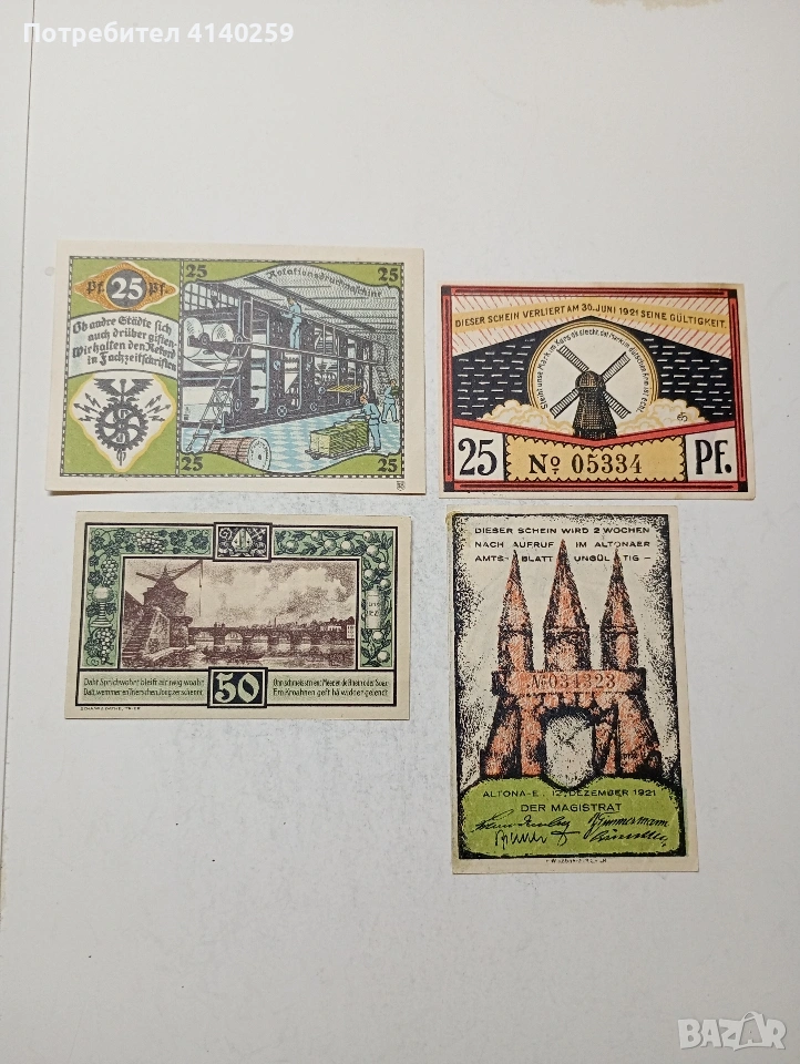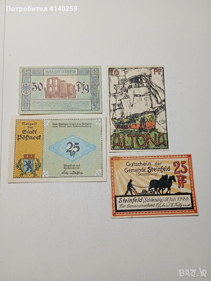 ГЕРМАНИЯ БАНКНОТИ ТИП НОТ ГЕЛ СПЕШНИ ПАРИ 50 ПФЕНИГА ГРАД ТРИР 1921 Г 25 ПФЕНИГА ГРАД ПЬОСНЕЦ 1921 Г 25 ПФЕНИГА ГРАД ШЛЕЗВИГ 1920 Г 20 ПФЕНИГА ГРАД АЛТОНА 1921 Г СЪСТОЯНИЕ НОВО ЦЕНА ЗА 4 БРОЯ ПОЛУЧАВАТЕ СНИМАНИТЕ БАНКНОТИ РАЗГЛЕДАЙТЕ ДРУГИТЕ МИ ОБЯВИ ДА КОМБИНИРАТЕ ДОСТАВКА ЕКОНТ ЗА ВАРНА ЛИЧНО