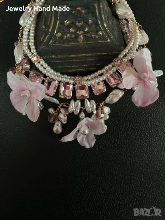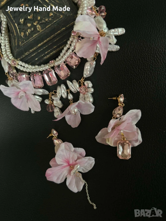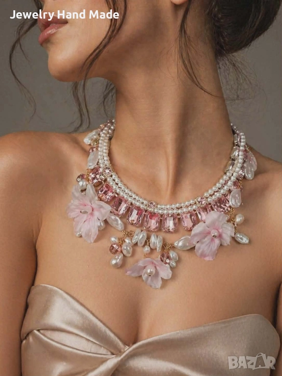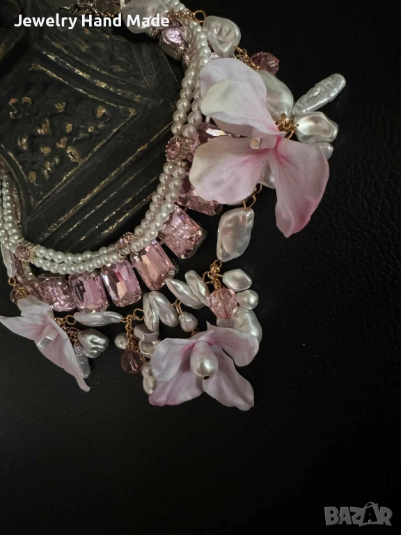 Ръчно изработено с внимание към всеки детайл- нежни перли, блестящи розови камъни и деликатни зветя, които сякаш току- що са откъснати от пролетна градина.