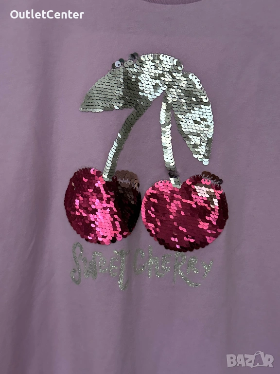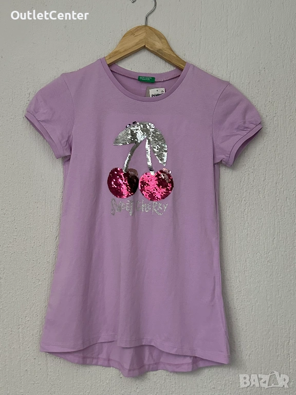 Детска тениска с пайети Benetton, размер по етикет XL, 150 см, 10-11 години, от рамо до рамо - 33 см, от миш. до миш. - 38 см, дължина - 60 см