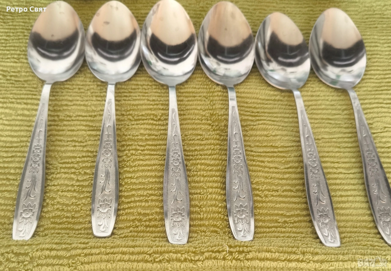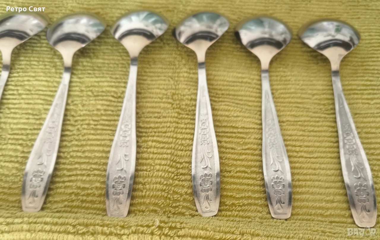 Комплект от шест стандартни лъжици за супа от неръждаема стомана, произведени в СССР. Красива изработка и изящен старинен дизайн, удобни и практични както за специален повод така и за ежедневна употреба. Цената е обща за всичко.