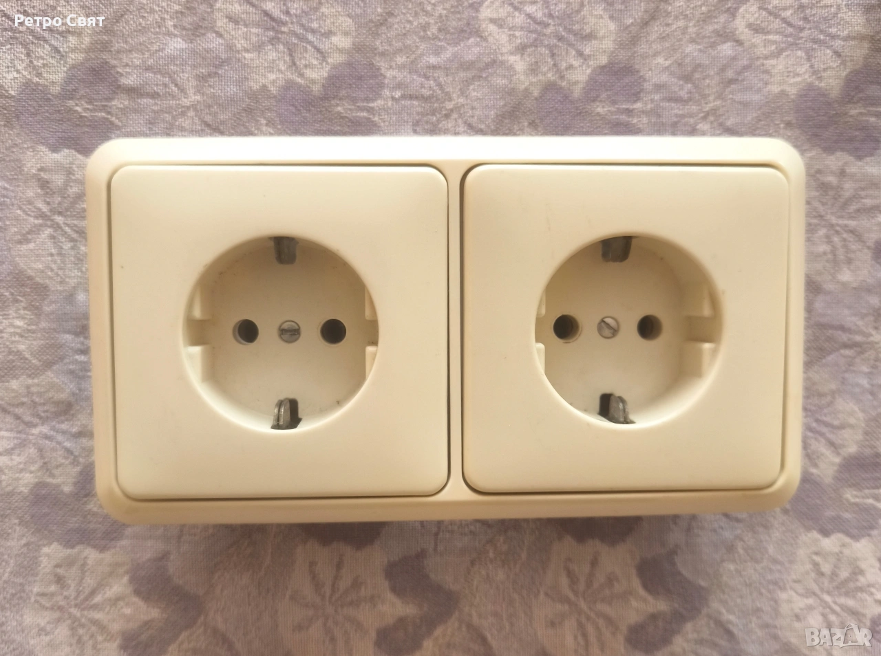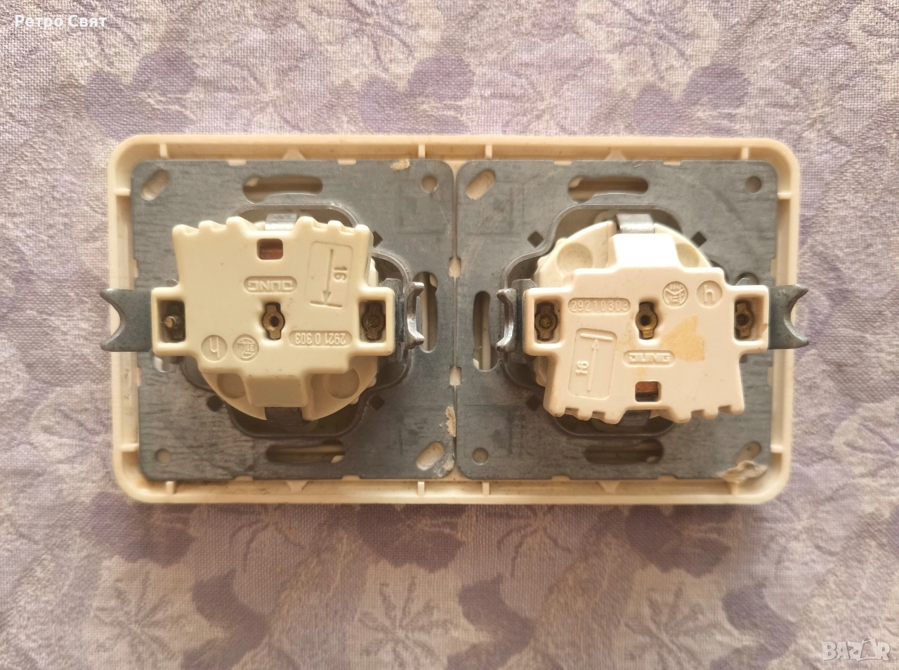 Немски двоен електрически контакт с две отделни порцеланови гнезда. Контакта е използван, но е напълно изряден, не създава никакви смущения на захранвани от него ел. уреди. Двойният метод на свързване го прави напълно надежден и безопасен за експлоатация при два свързани и консумиращи едновременно ел. енергия ел. уреди. В безупречно техническо и визуално състояние.