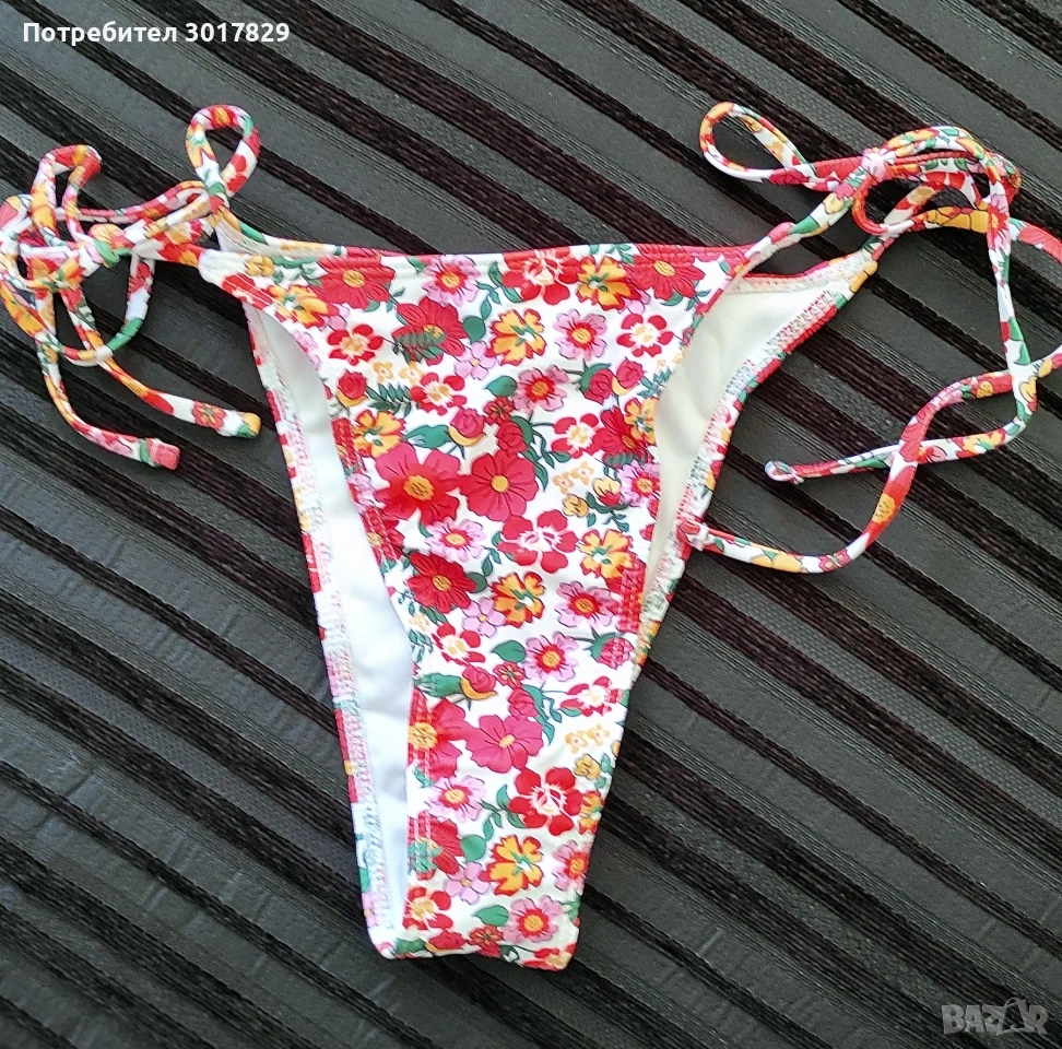 Комплект бански, ползван само 3 пъти, българско производство, горнището е с банели и твърди неподвижни подплънки нормална дебелина, чашка Б, връзва се отзад и на гърба. Материята е супер качество. Долнището на ситни цветя е също размер М, но е дълбоко, ПОДАРЪК е. Чисто ново, с хигиенна лепенка.
