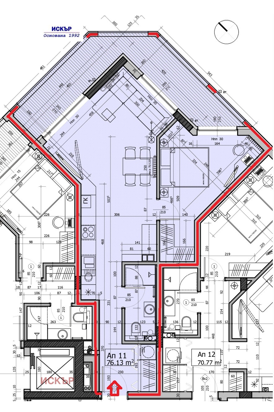 Застроената площ на имота е 76.13 кв.м, площта с общи части е 94.70 кв.м.
