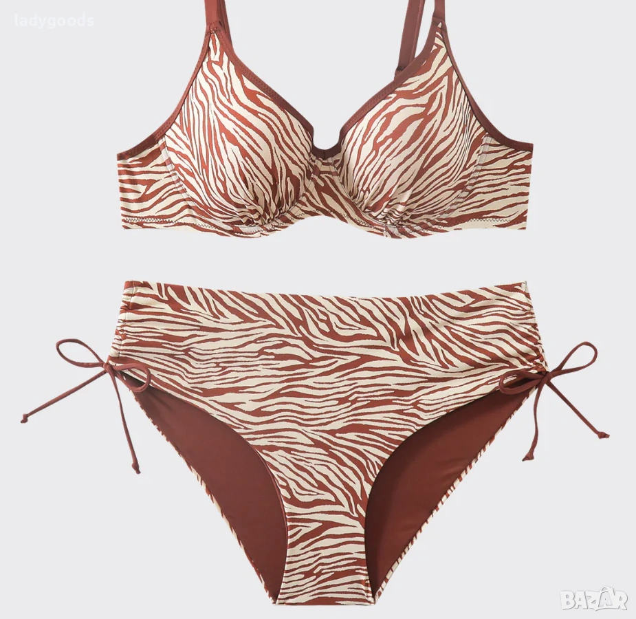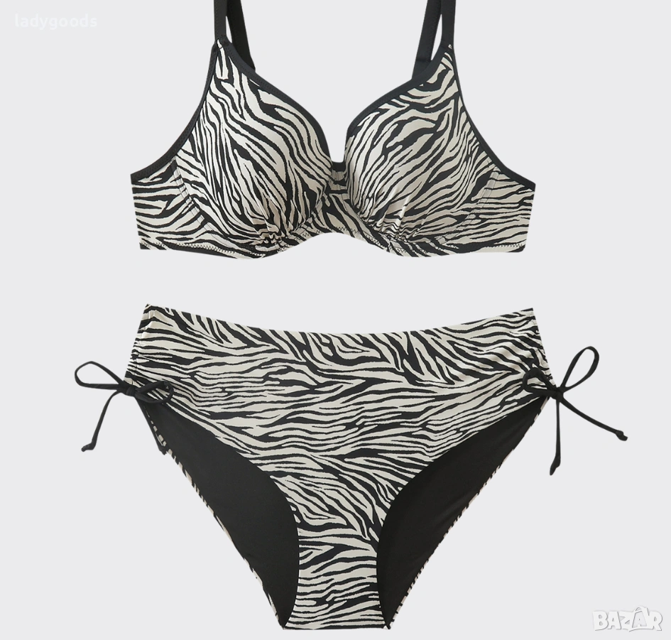 Този бански костюм,съчетава зебров принт с поддържаща бюста кройка., Горнището е чашки,с банели и подсилени шевове за оптимална поддръжка,чашата приляга без да мачкат гърдите.Регулируеми презрамки. Бикината е с нормална талия и с функционални странични връзки, позволяващи прецизно прилягане в областта на ханша.