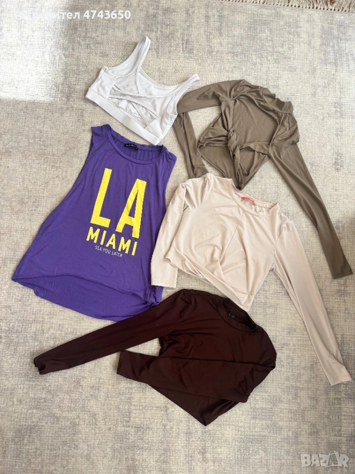 Неразличими от нови, без никаква дефекти, обличани по веднъж. Блузите с дълъг ръкав са по 3€, а взети заедно 7.50€. Потниците са по 1.50€, а заедно 2.50€. Всичко взето заедно 8€.
