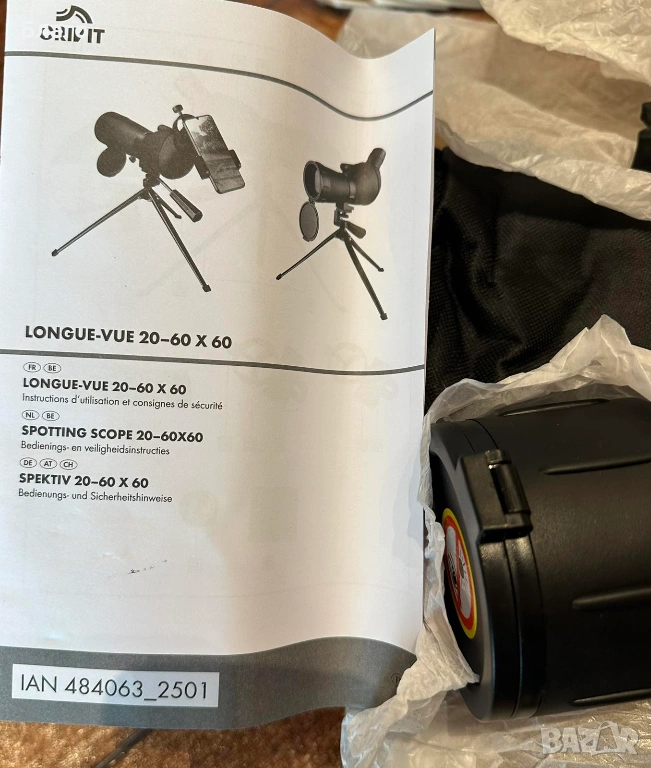 Включва капачка за окуляра, калъф за пренасяне, кърпа за почистване и ръководство за употреба