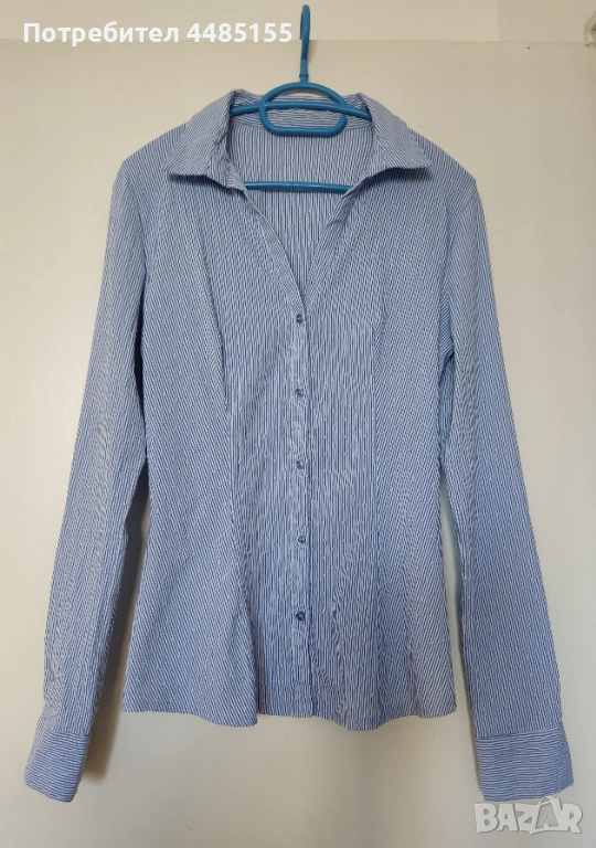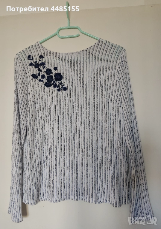 Риза/блуза LCW, S/М. Чудесен модел и плат. Дълъг ръкав, обло деколте, копчета отзад по цялата дължина. Красива бродерия от тъмносини цветя в една част отпред. Материя разтеглива. Принт тъмносиньо райе на бял фон. В отлично състояние.