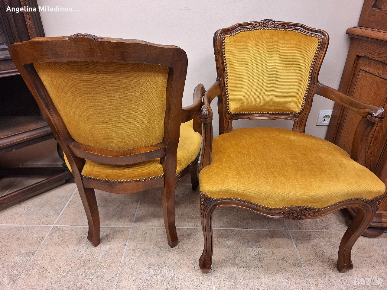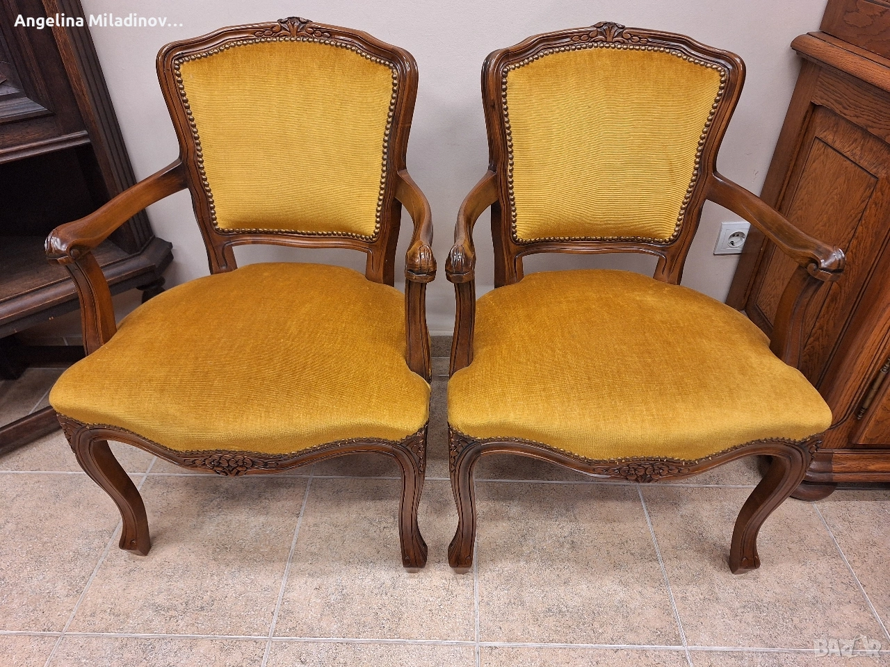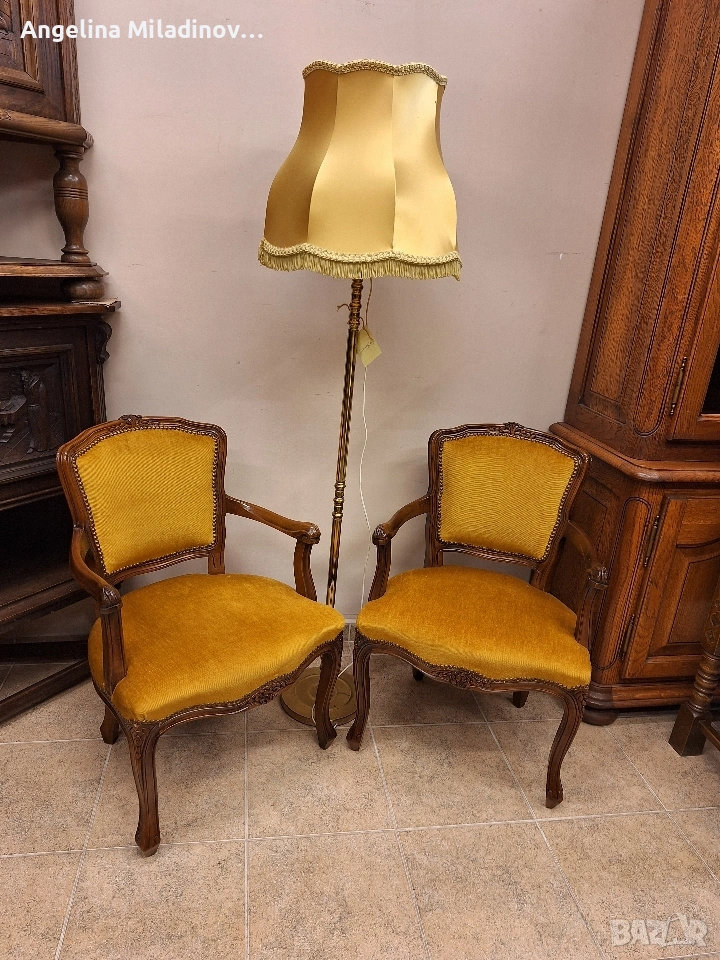 Комплект кресла Луи XV. Изключително красиви двойка кресла, внос от Дания. Креслата са с богата дърворезба и красива плюшина дамаска в цвят горчица. Месингови капси допълват винтидж стила. Много здрави и удобни. Креслата ще внесат винтидж акцент във вашия дом или офис. Разгледайте и другите ми обяви. Последвайте ни и във фейсбук Мебели шик. Предлагаме и изгоден транспорт за цялата страна. Размери: Дължина - 58 см. Дълбочина - 62 см. Височина - 82 см. Цена - 225 € за комплекта 440,06 лв.