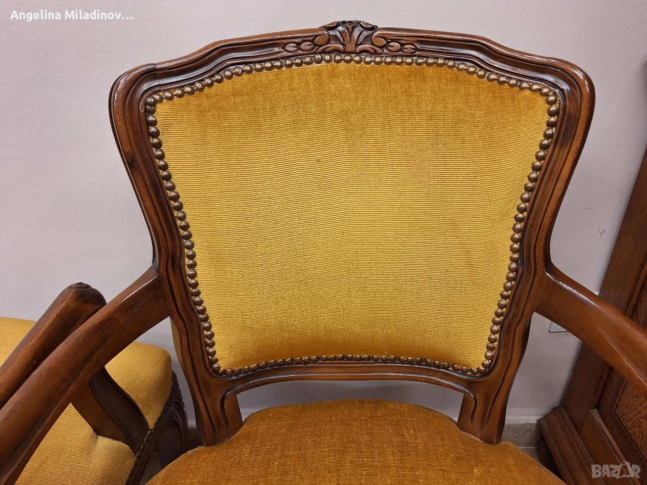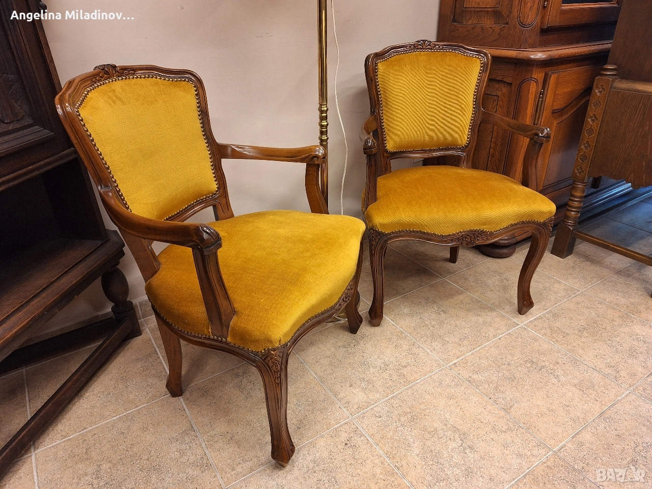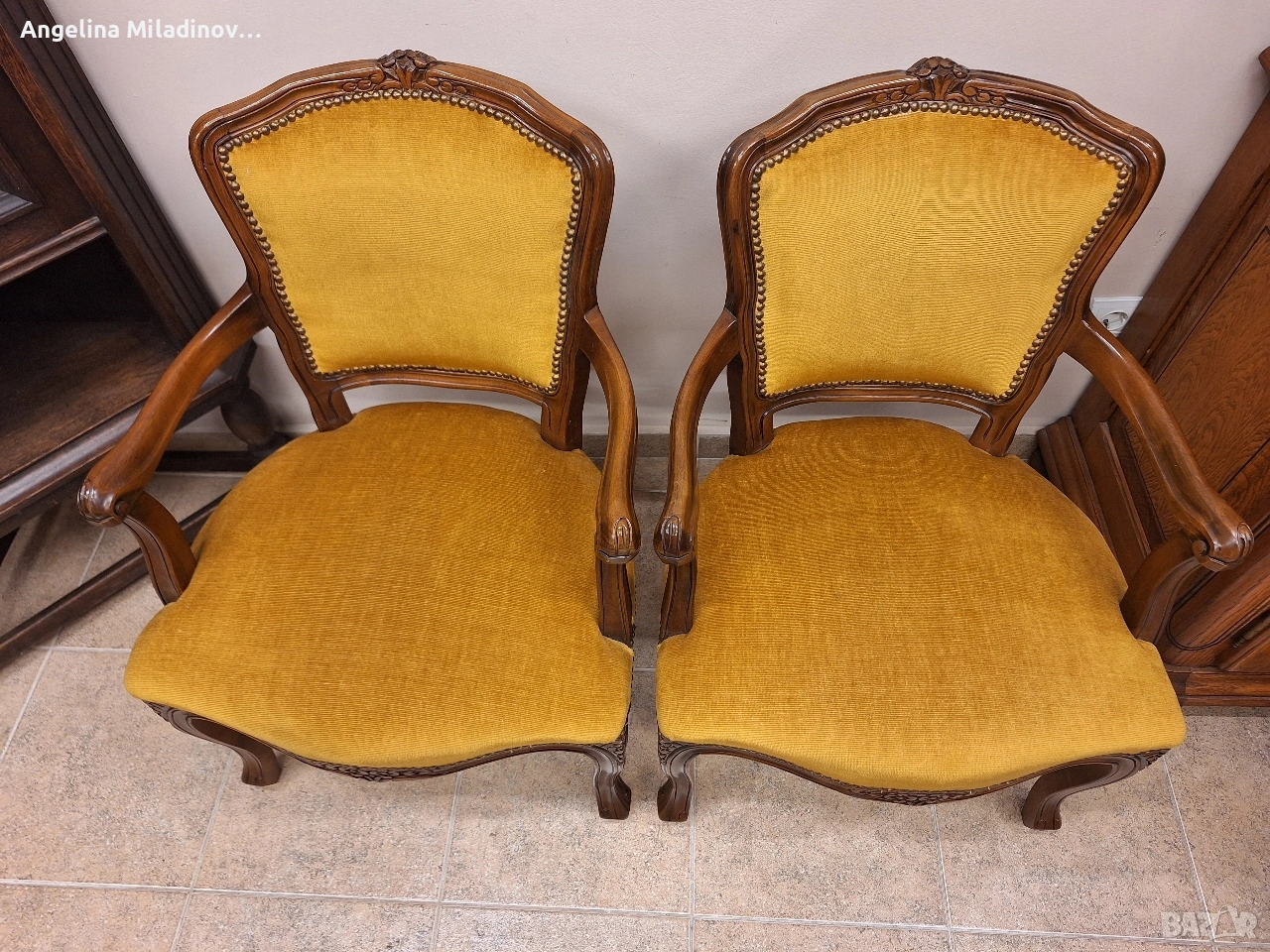 Комплект кресла Луи XV. Изключително красиви двойка кресла, внос от Дания. Креслата са с богата дърворезба и красива плюшина дамаска в цвят горчица. Месингови капси допълват винтидж стила. Много здрави и удобни. Креслата ще внесат винтидж акцент във вашия дом или офис. Разгледайте и другите ми обяви. Последвайте ни и във фейсбук Мебели шик. Предлагаме и изгоден транспорт за цялата страна. Размери: Дължина - 58 см. Дълбочина - 62 см. Височина - 82 см. Цена - 225 € за комплекта 440,06 лв.
