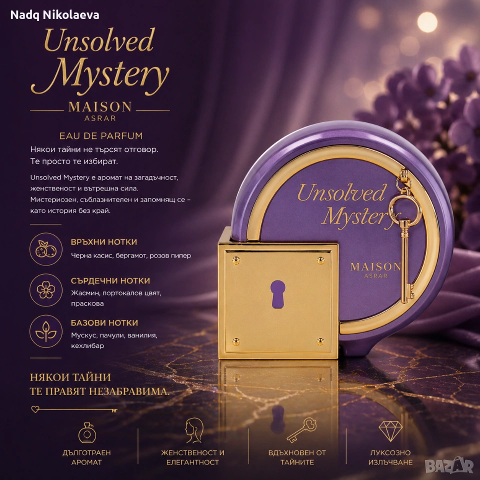 Maison Asrar Unsolved Mystery Eau de Parfum е аромат, обвит в загадъчност, женственост и фин лукс. Създаден за онези моменти, в които не искаш просто да бъдеш забелязана, а запомнена. Нежните флорални и плодови нюанси се срещат с топла, чувствена основа, оставяйки след себе си елегантна и мистериозна следа.