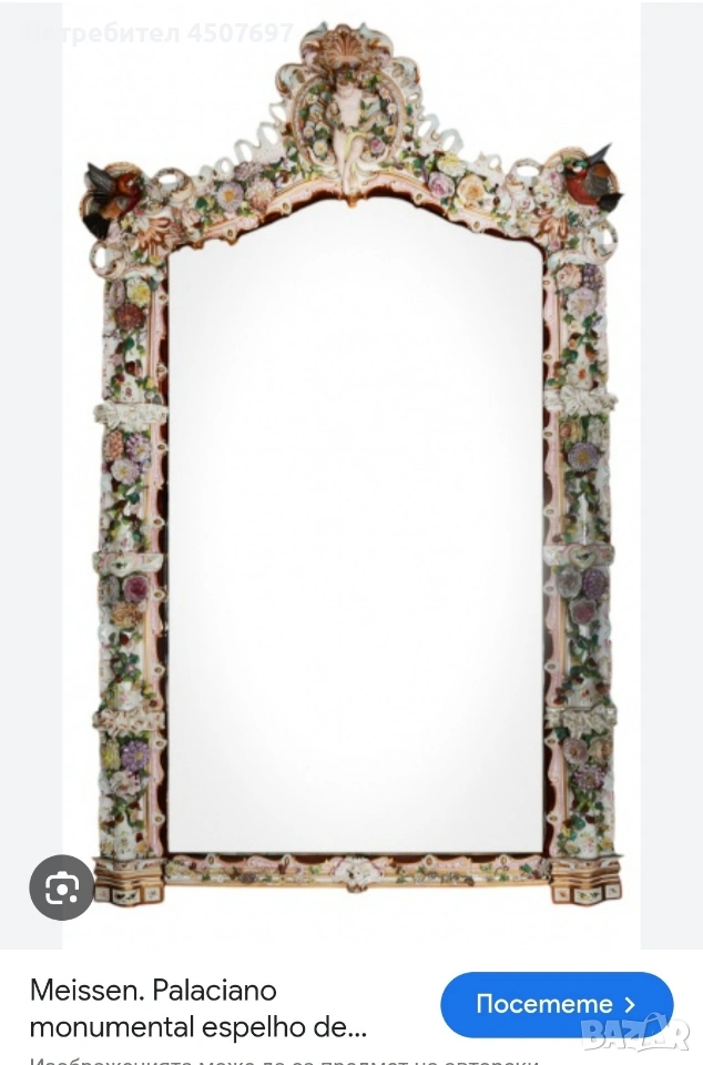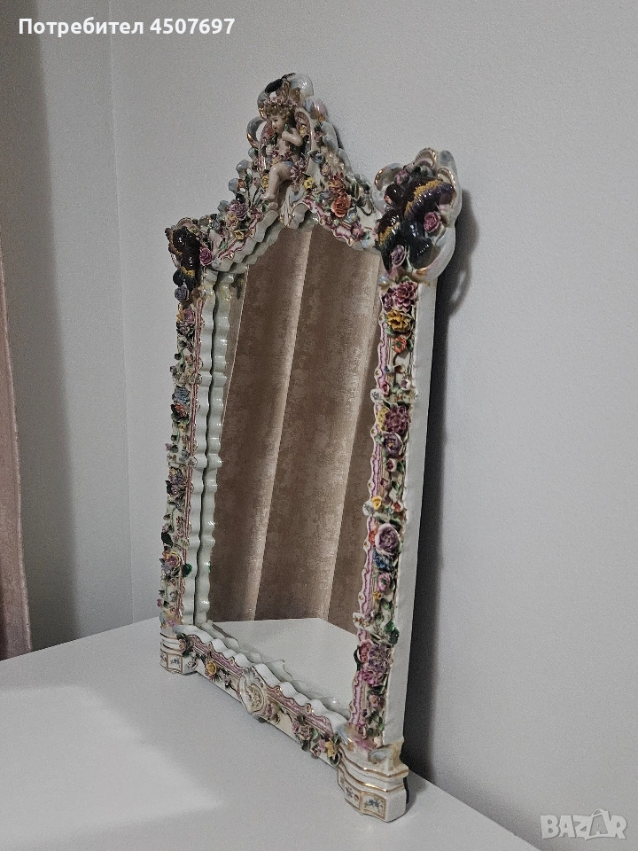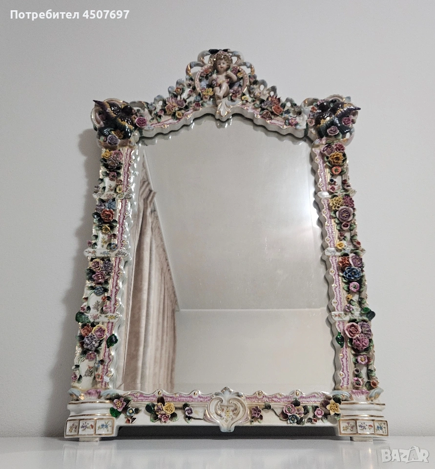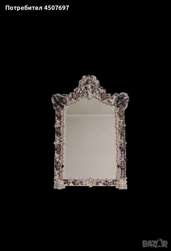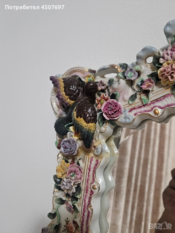 Това е изящно огромно огледало с рамка от порцелан, спорет Мен е Maissen и Drezden, не искам да подвеждам никого с мнението си!