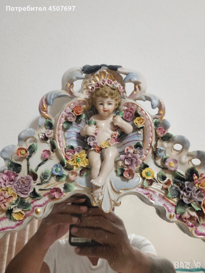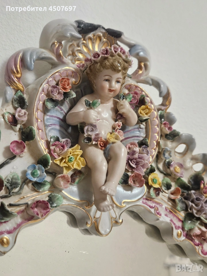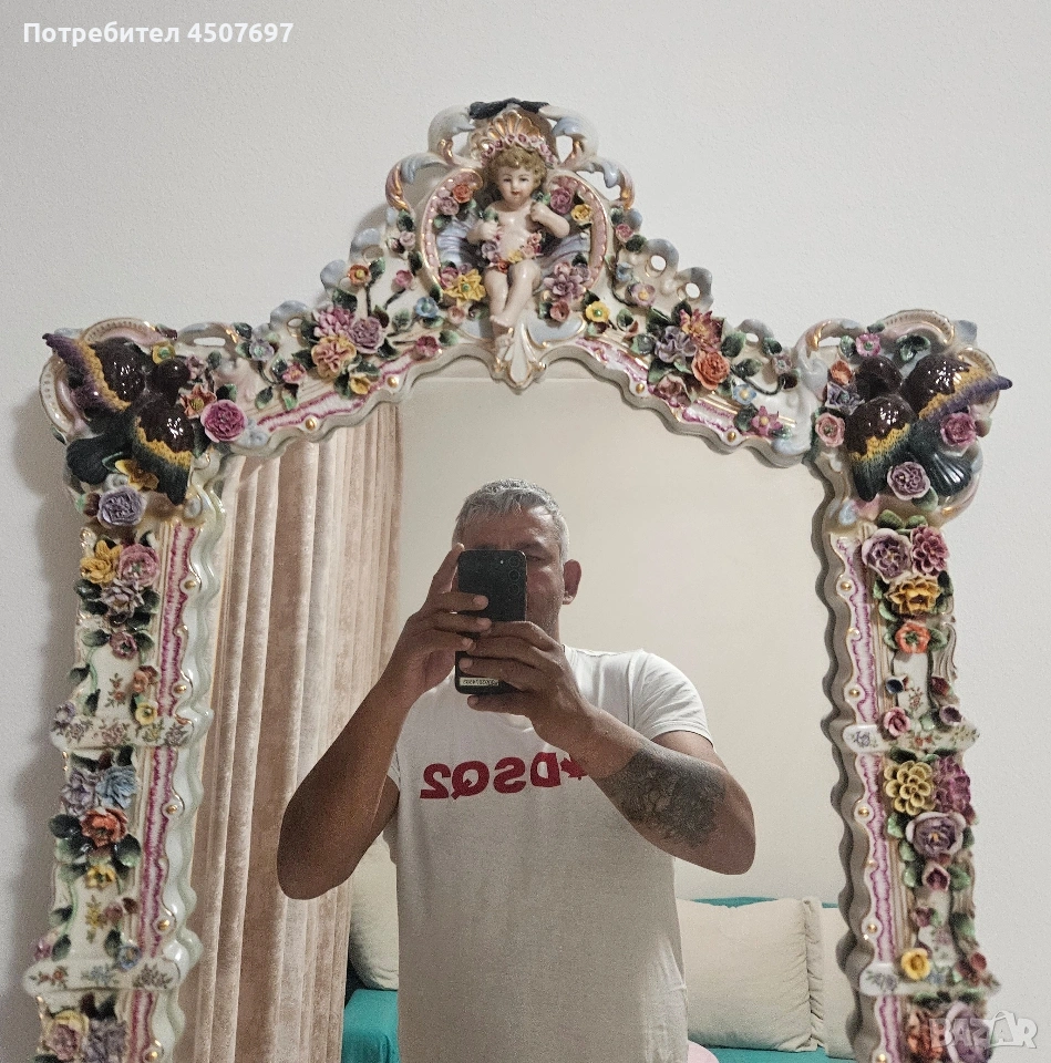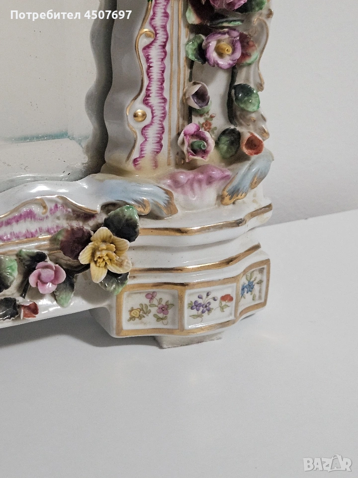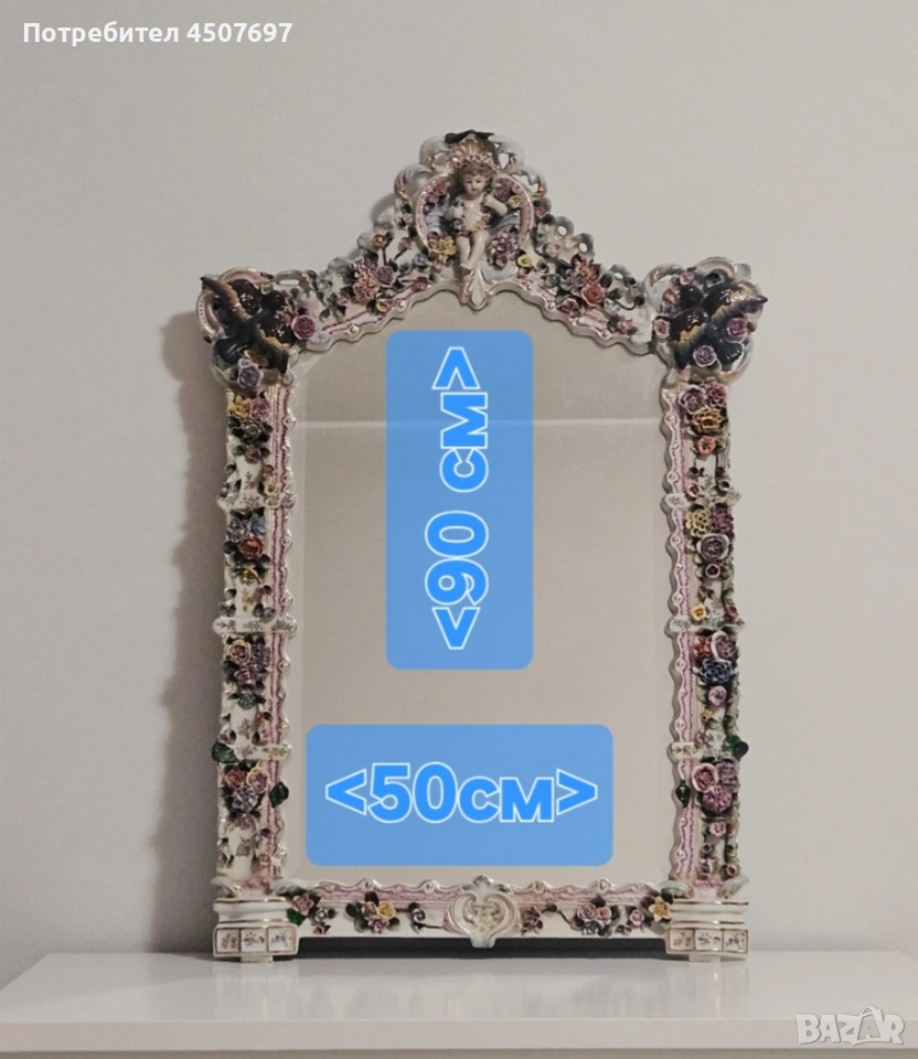 Това е изящно огромно огледало с рамка от порцелан, спорет Мен е Maissen и Drezden, не искам да подвеждам никого с мнението си!