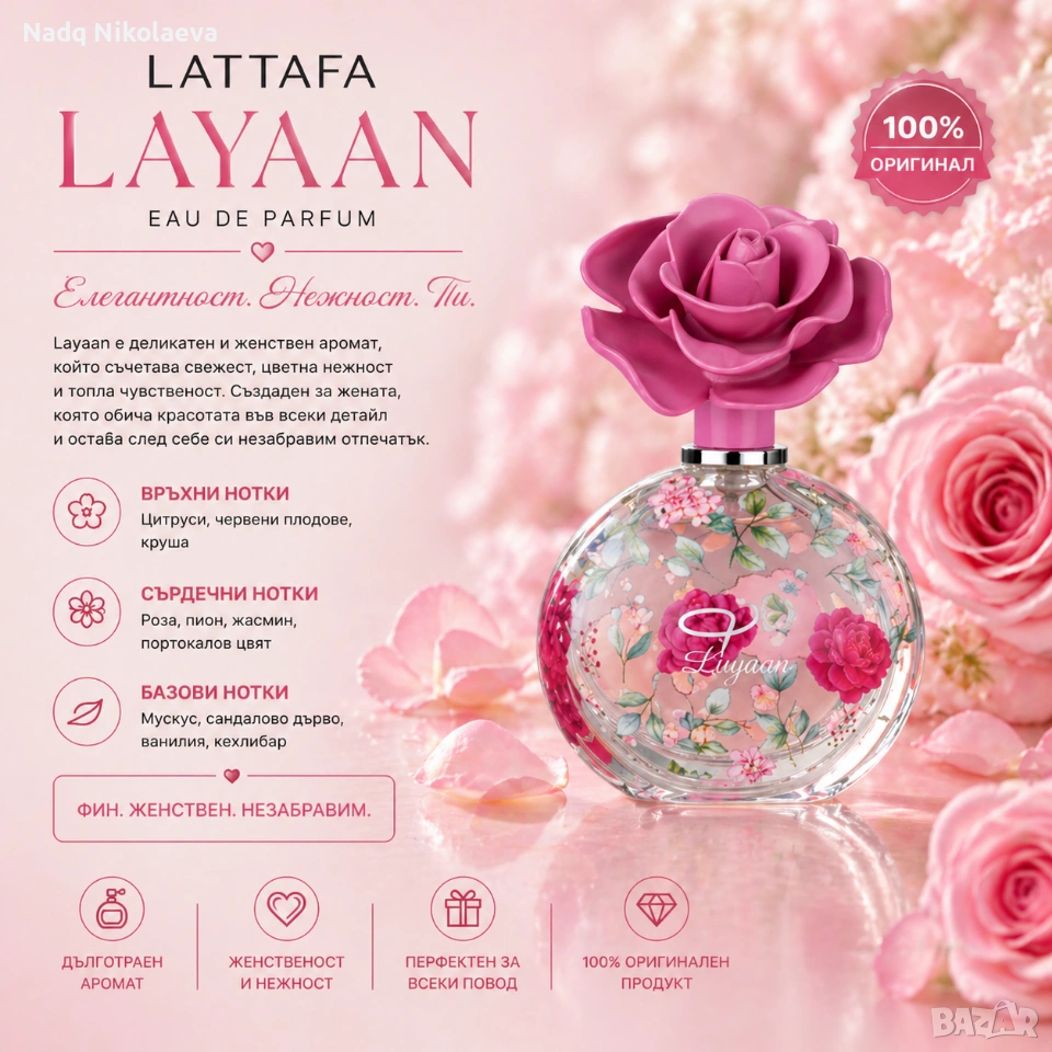 Lattafa Layaan Eau de Parfum е елегантен и нежен дамски аромат, създаден за жената, която обича фината красота и романтичното излъчване. Свежите цитрусови и плодови нотки се преплитат с нежни цветя и топла мускусна основа, оставяйки деликатна, женствена и запомняща се следа.